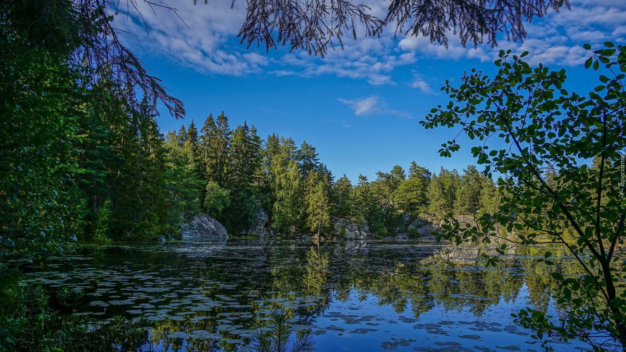Edytor tapety: Drzewa i skały odbijają się w letniej rzece