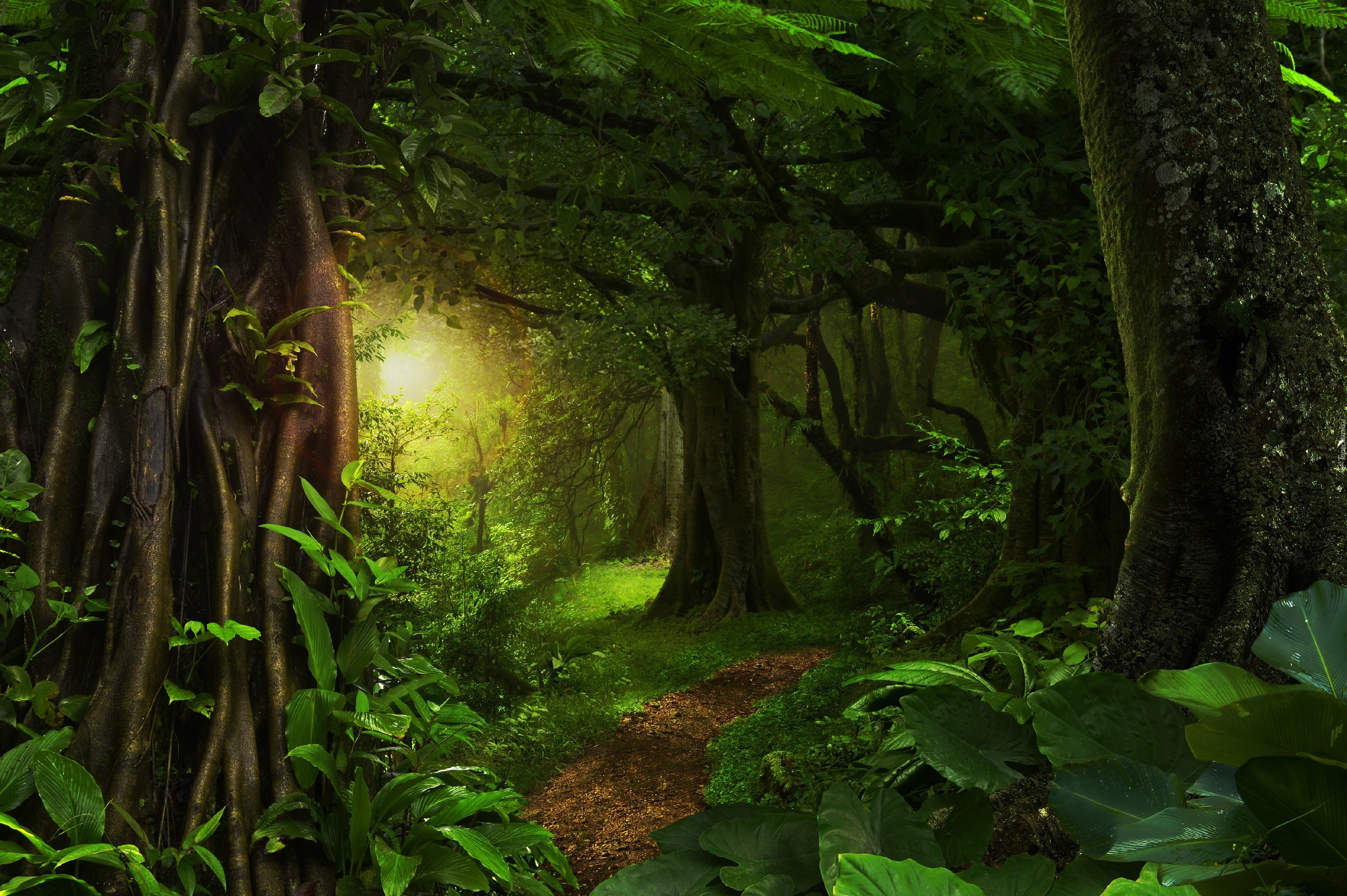 Edytor tapety: Ścieżka w dżungli wśród drzew i przebijające światło