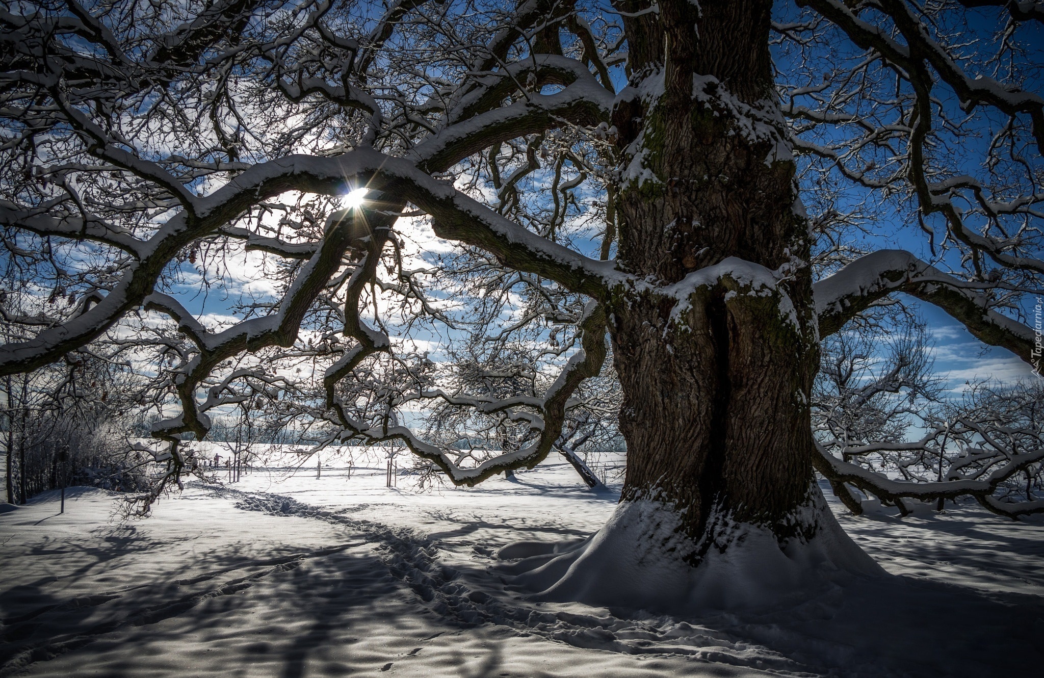 Edytor tapety: Duże ośnieżone drzewo w promieniach słońca o świcie