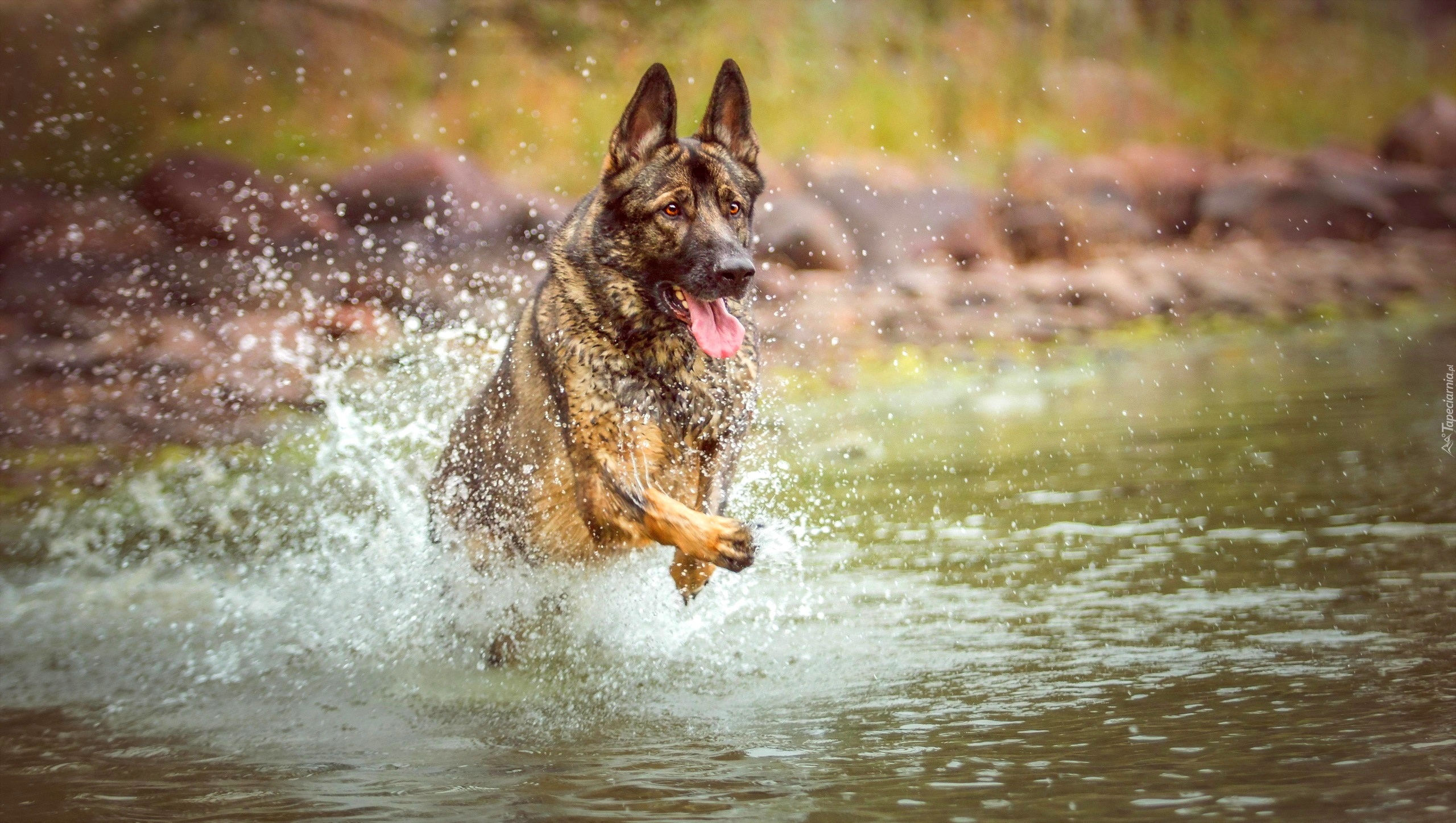 Edytor tapety: Owczarek niemiecki rozbryzguje wodę biegnąc