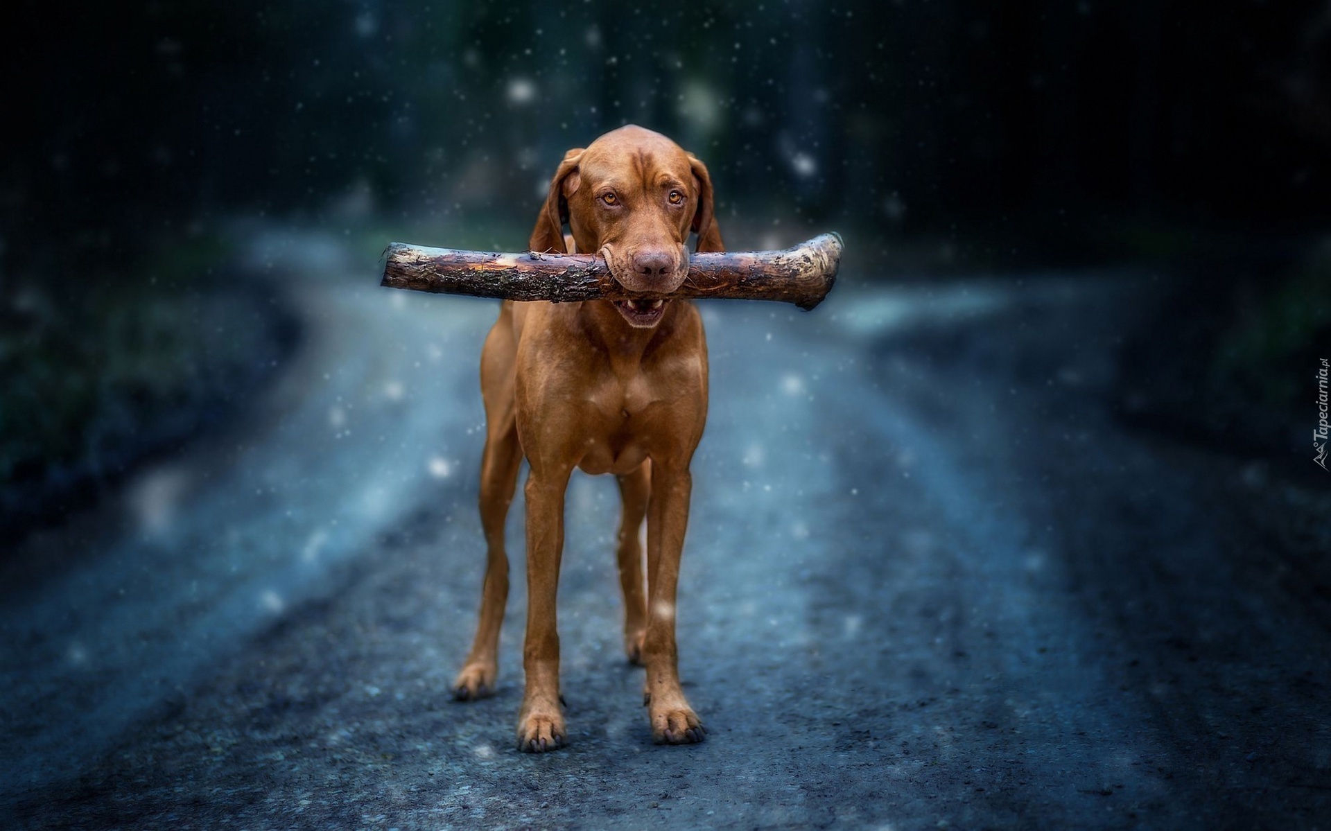 Edytor tapety: Wyżeł węgierski aportuje patyk na drodze