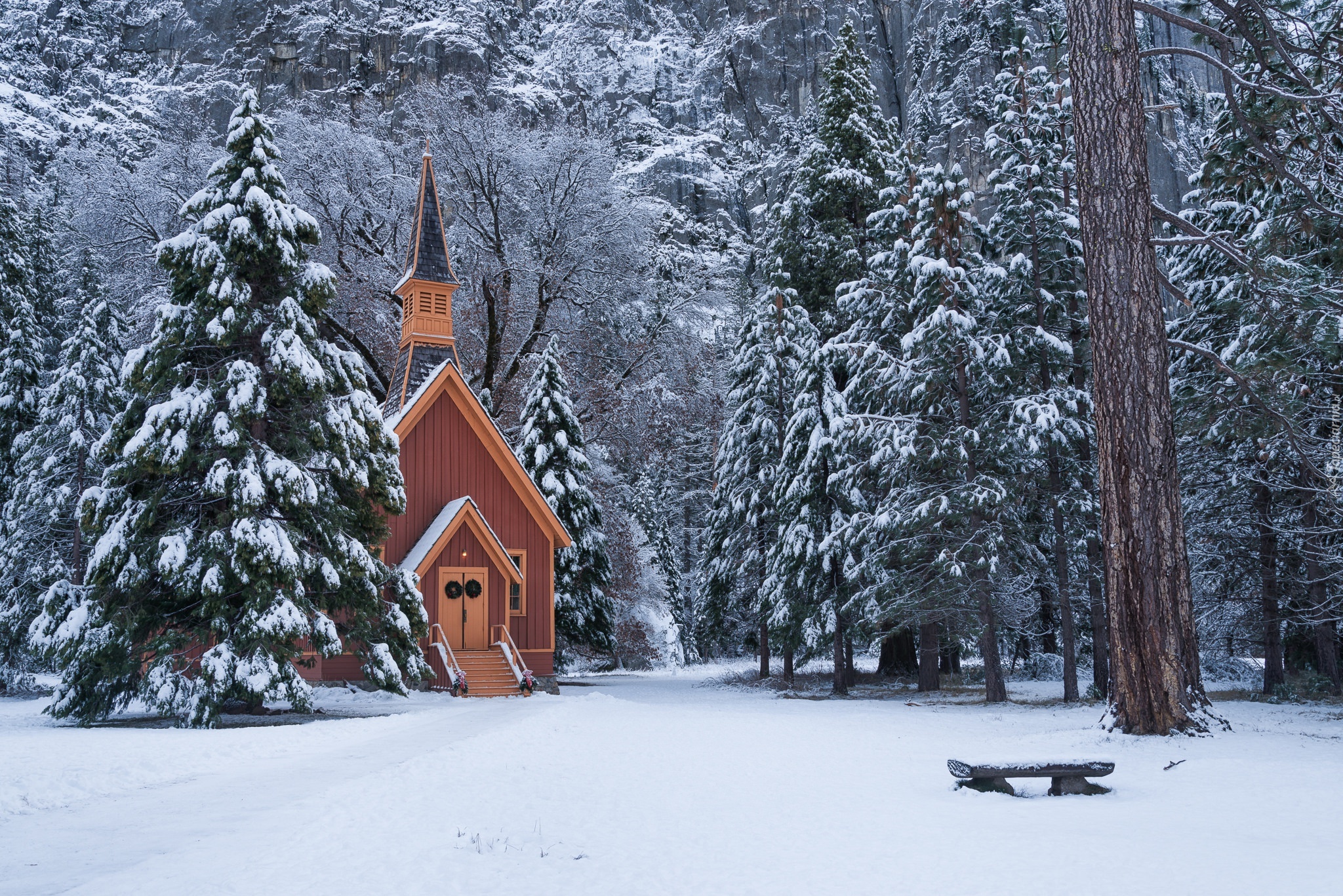 Edytor tapety: Kościółek przy leśnej drodze pośród ośnieżonych drzew