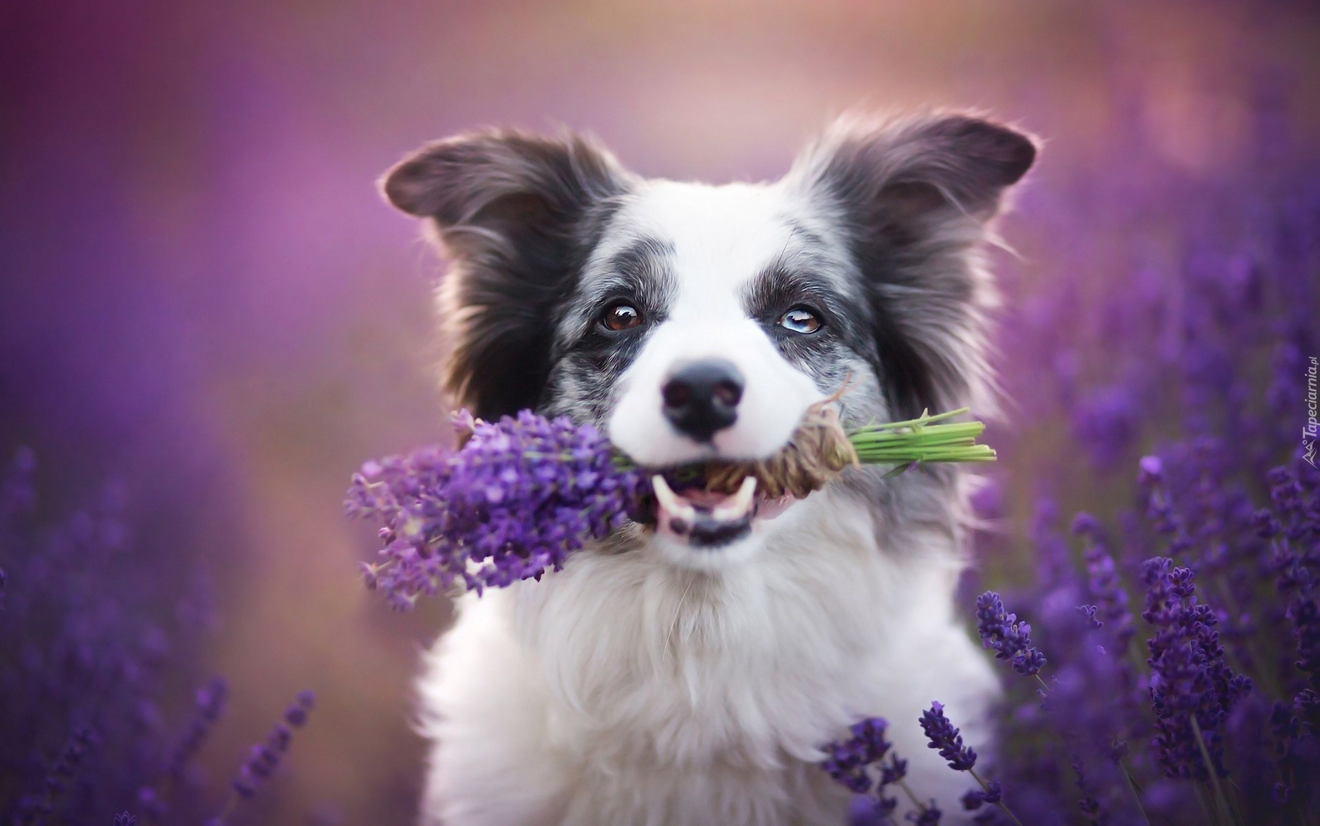Edytor tapety: Border collie z bukiecikiem lawendy w pyszczku
