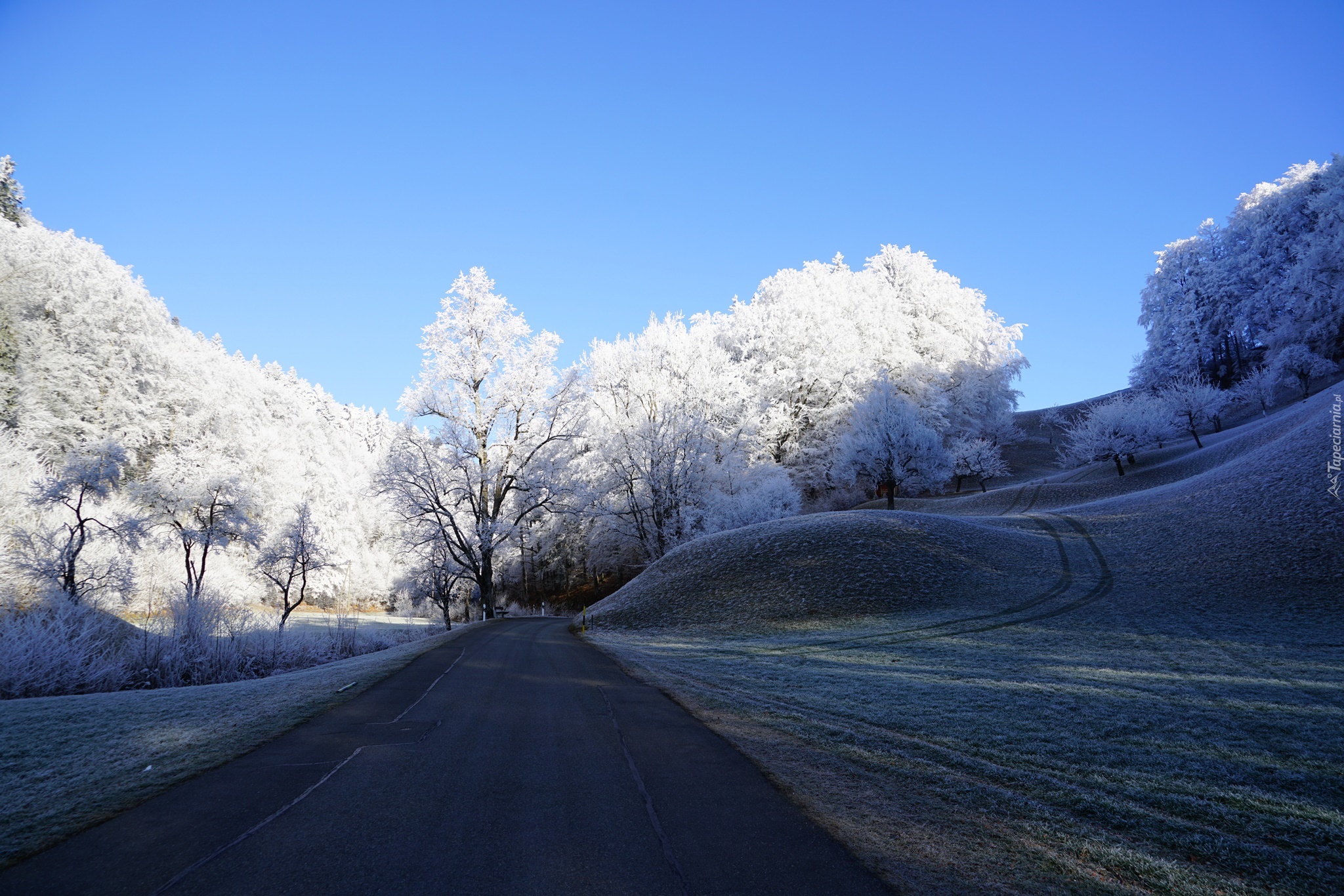 Edytor tapety: Droga i drzewa w słoneczny zimowy dzień