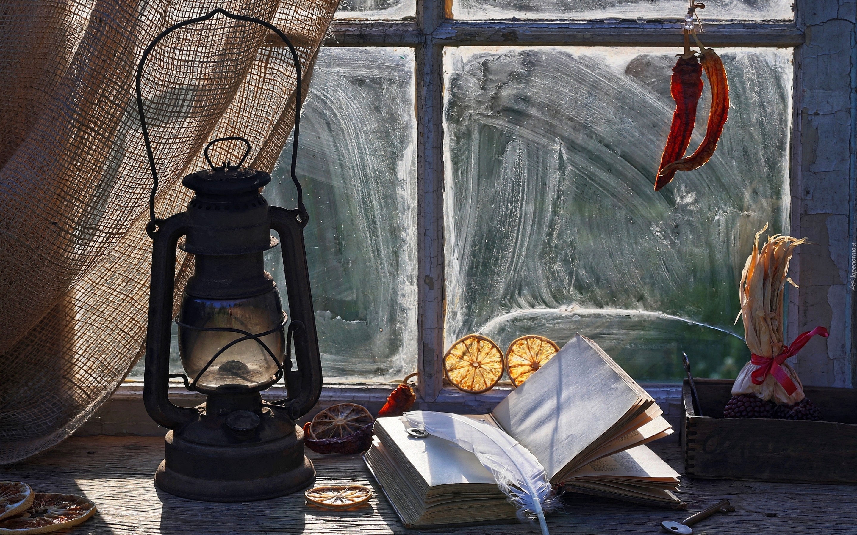 Edytor tapety: Kompozycja z lampą naftową i książką na oknie