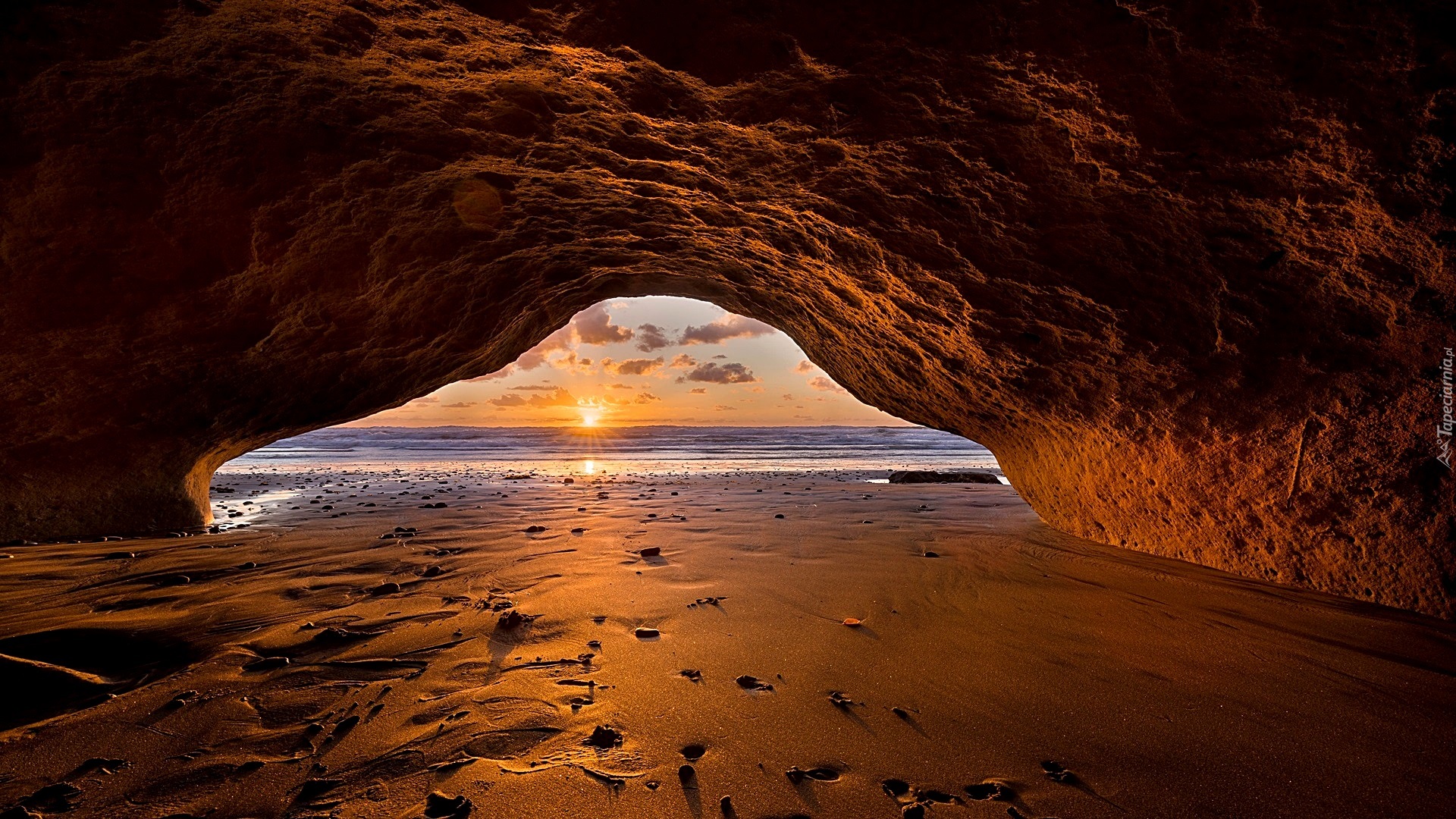 Edytor tapety: Widok z jaskini na morze i zachód słońca