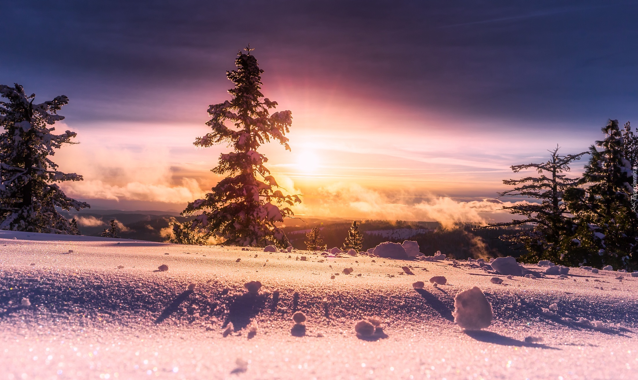 Edytor tapety: Drzewa w ośnieżonych górach o świcie