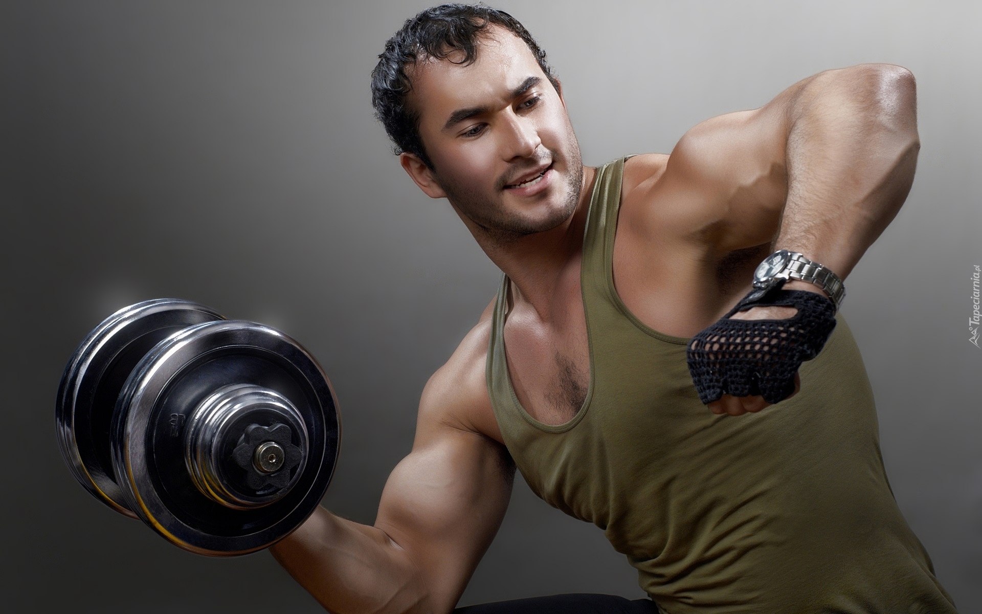 Edytor tapety: Mężczyzna z ciężarkiem gimnastycznym ćwiczy bicepsy