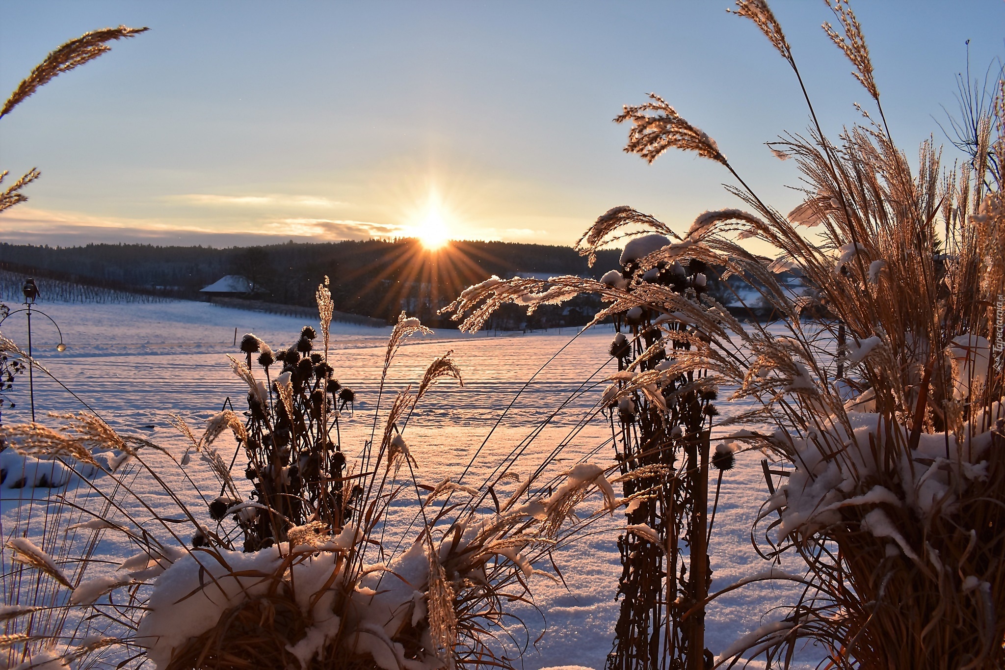 Edytor tapety: Ośnieżone pole i trawy w blasku wschodzącego słońca