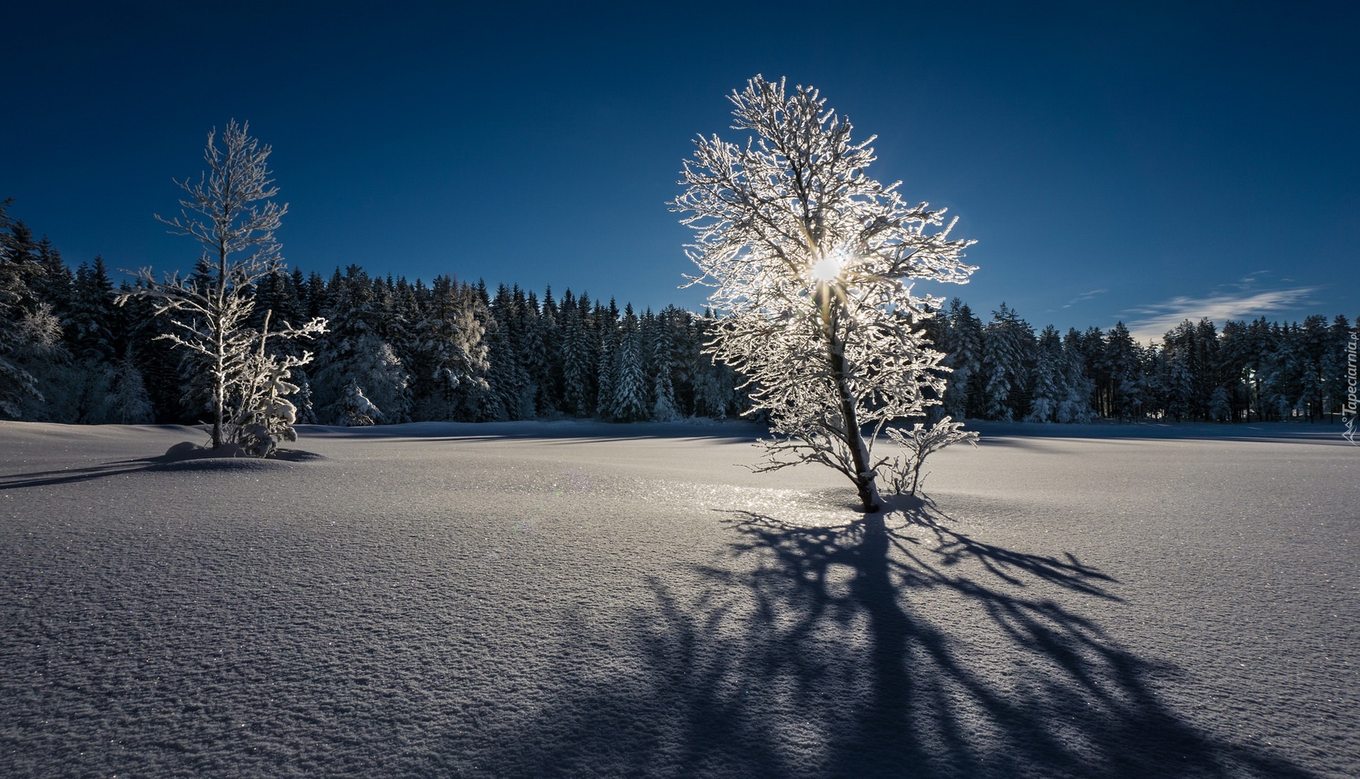 Edytor tapety: Wschodzące słońce promykami wita samotne drzewo na śniegu