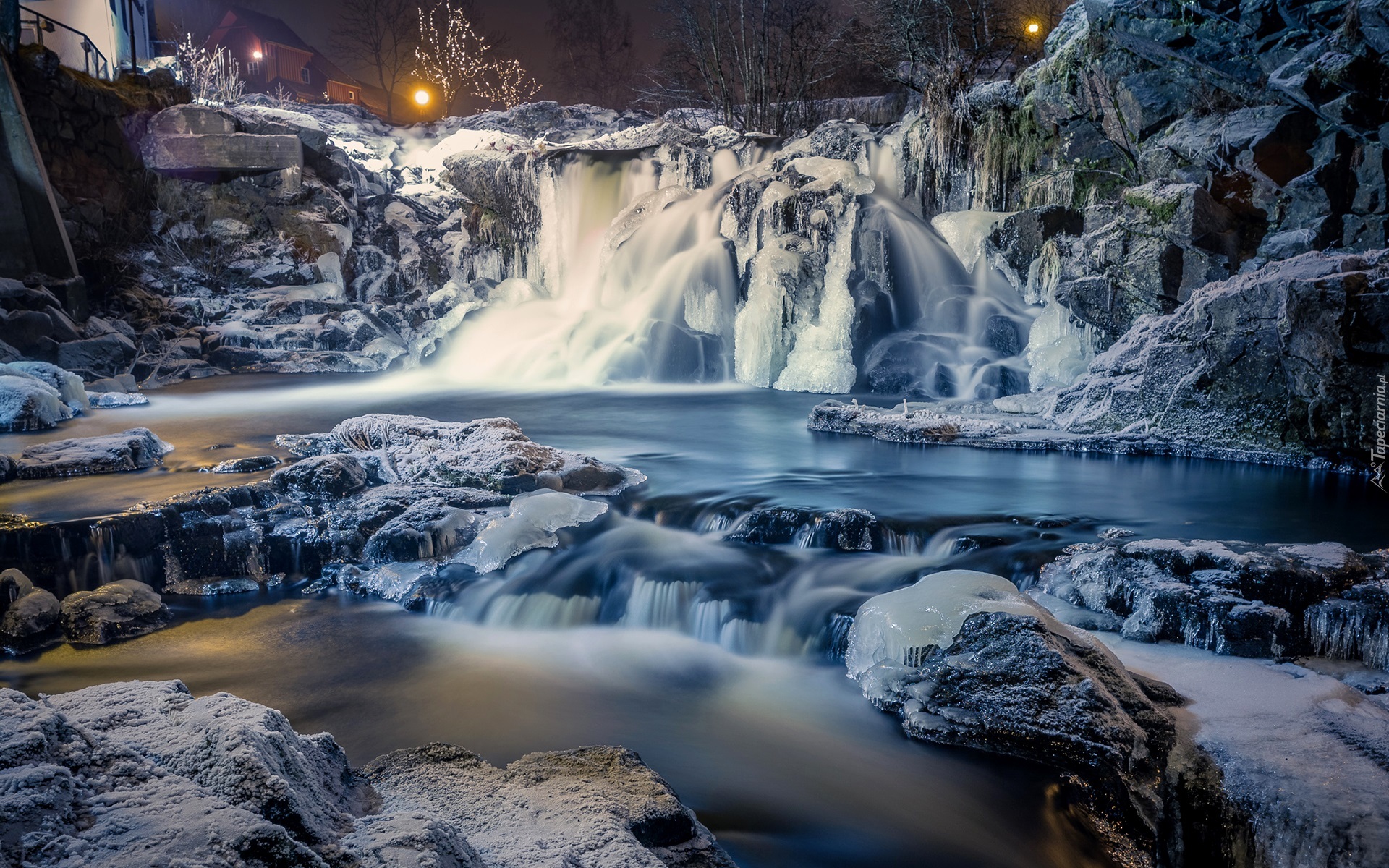Edytor tapety: Skalny wodospad wpada do oblodzonej rzeki