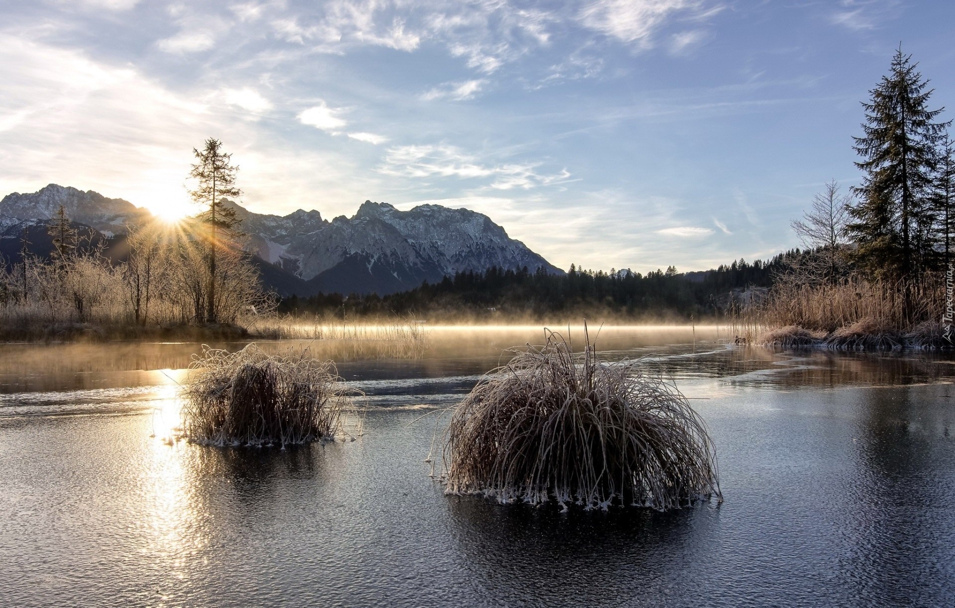 Edytor tapety: Oszronione kępy traw na jeziorze o poranku