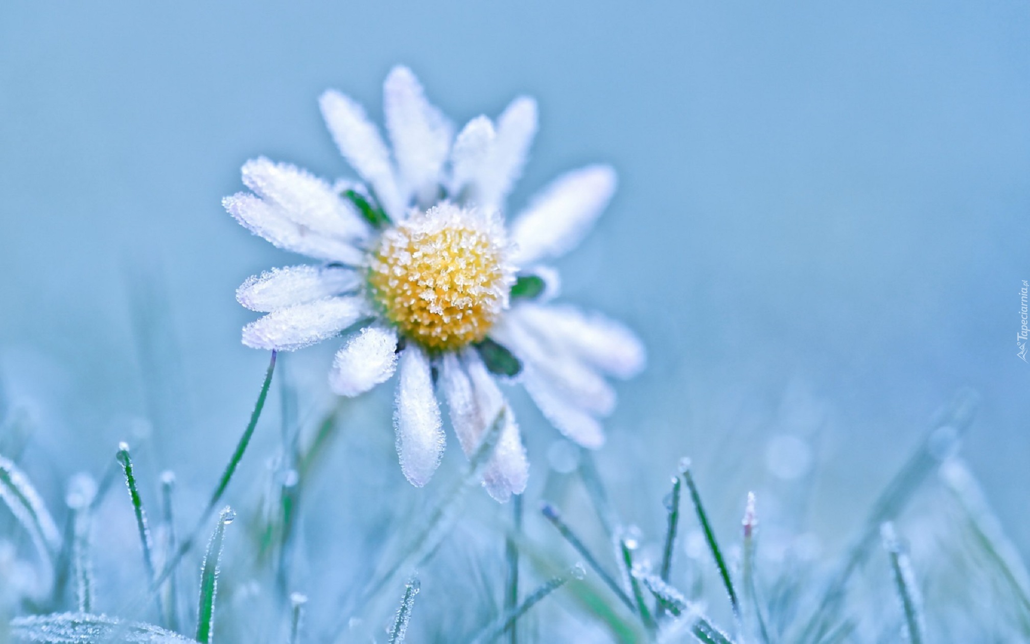 Edytor tapety: Oszroniona biała stokrotka w trawie