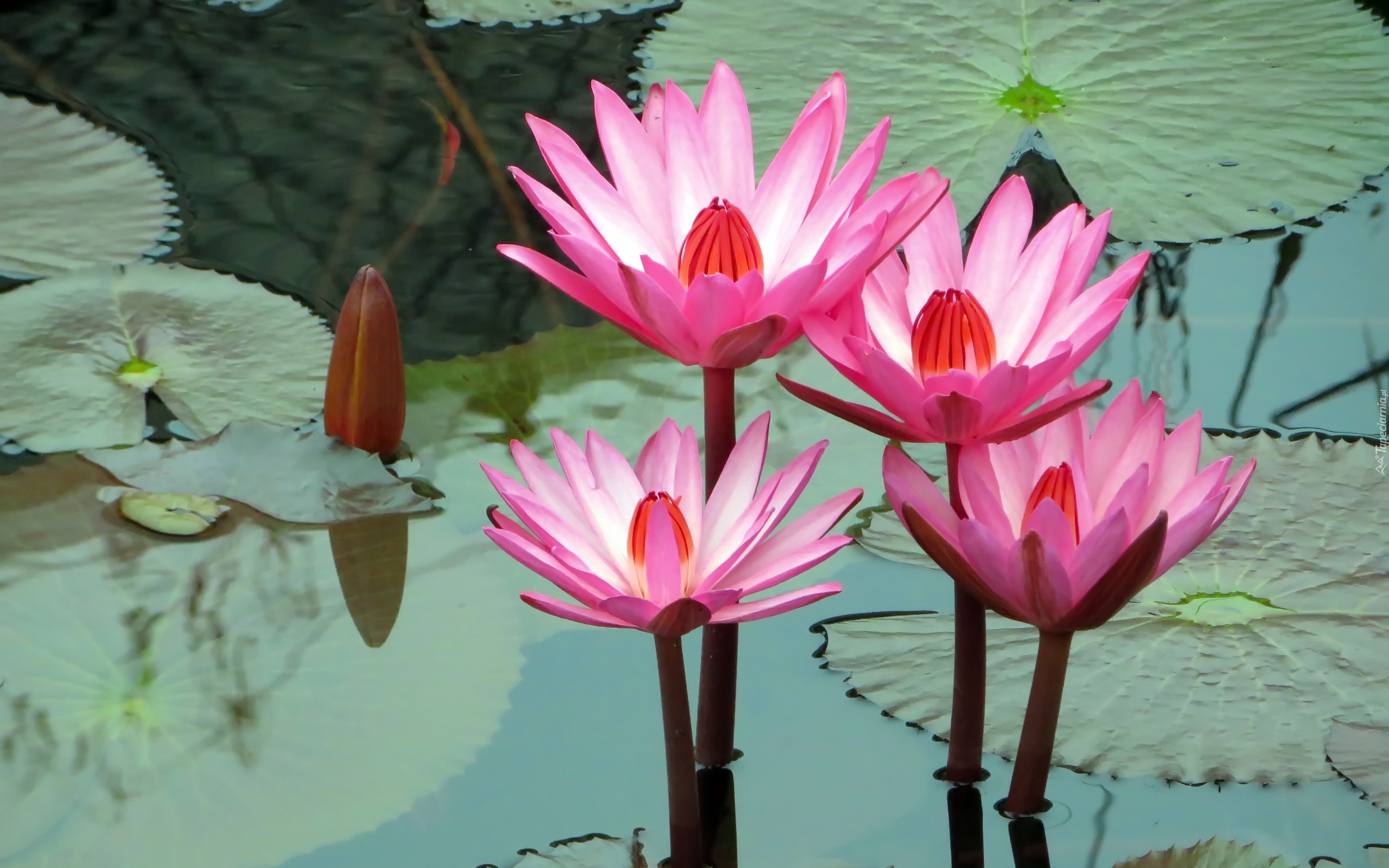 Edytor tapety: Różowe lilie wodne na łodyżkach pośród liści