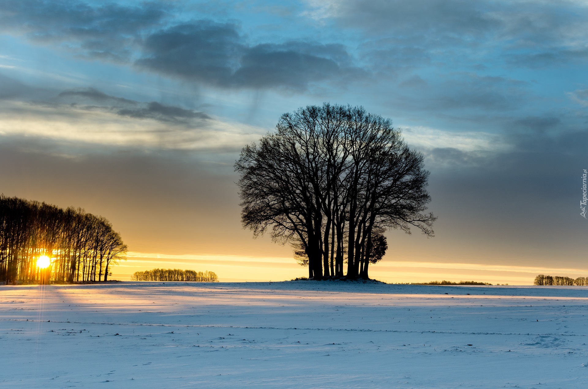 Edytor tapety: Drzewa na zimowym polu w blasku zachodzącego słońca