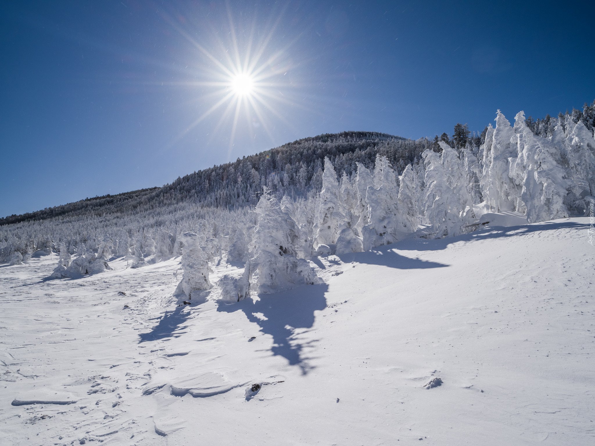 Edytor tapety: Promienie słońca padające na wzgórze z ośnieżonymi drzewami