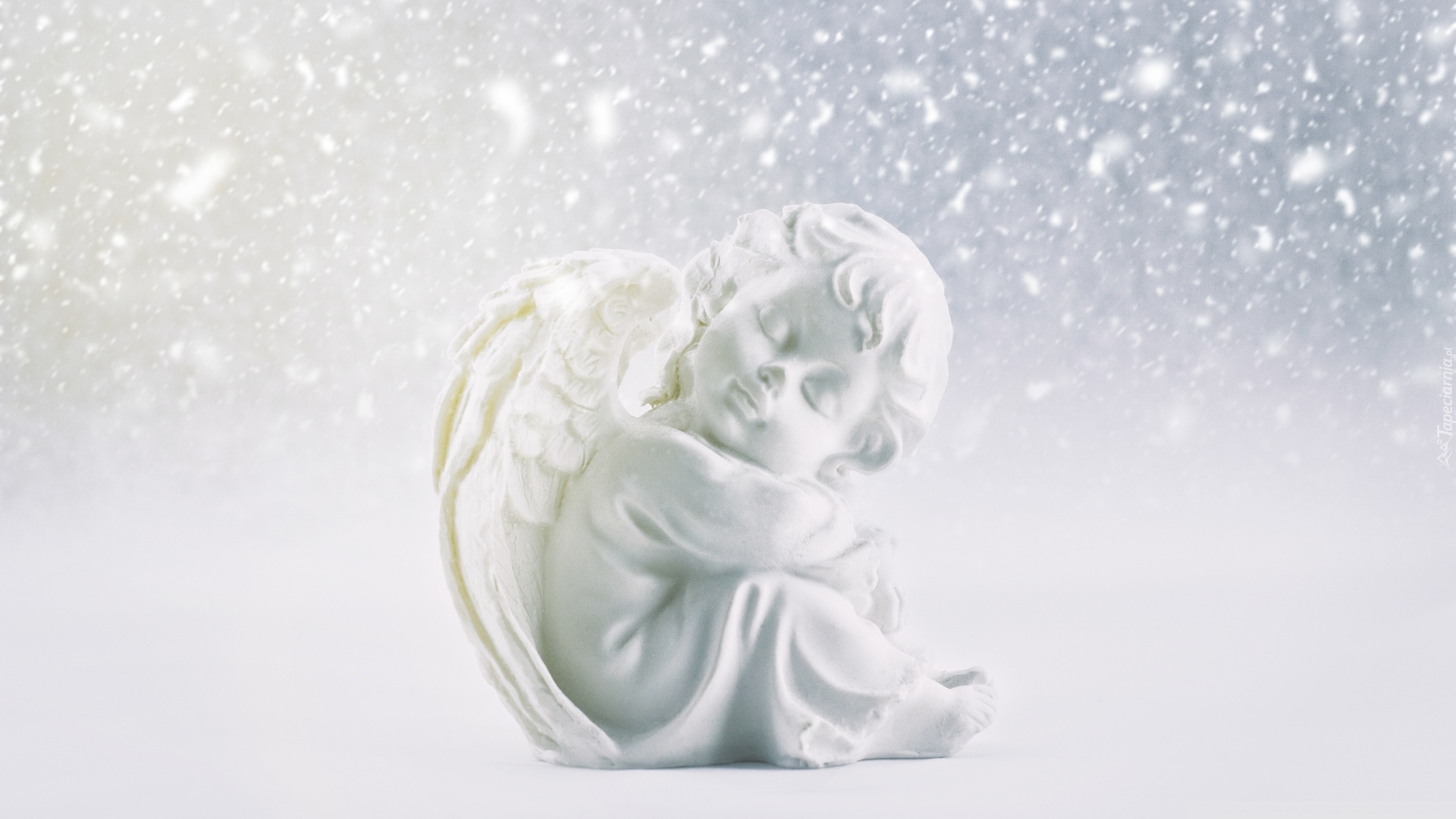 Edytor tapety: Figurka białego aniołka i płatki padającego śniegu