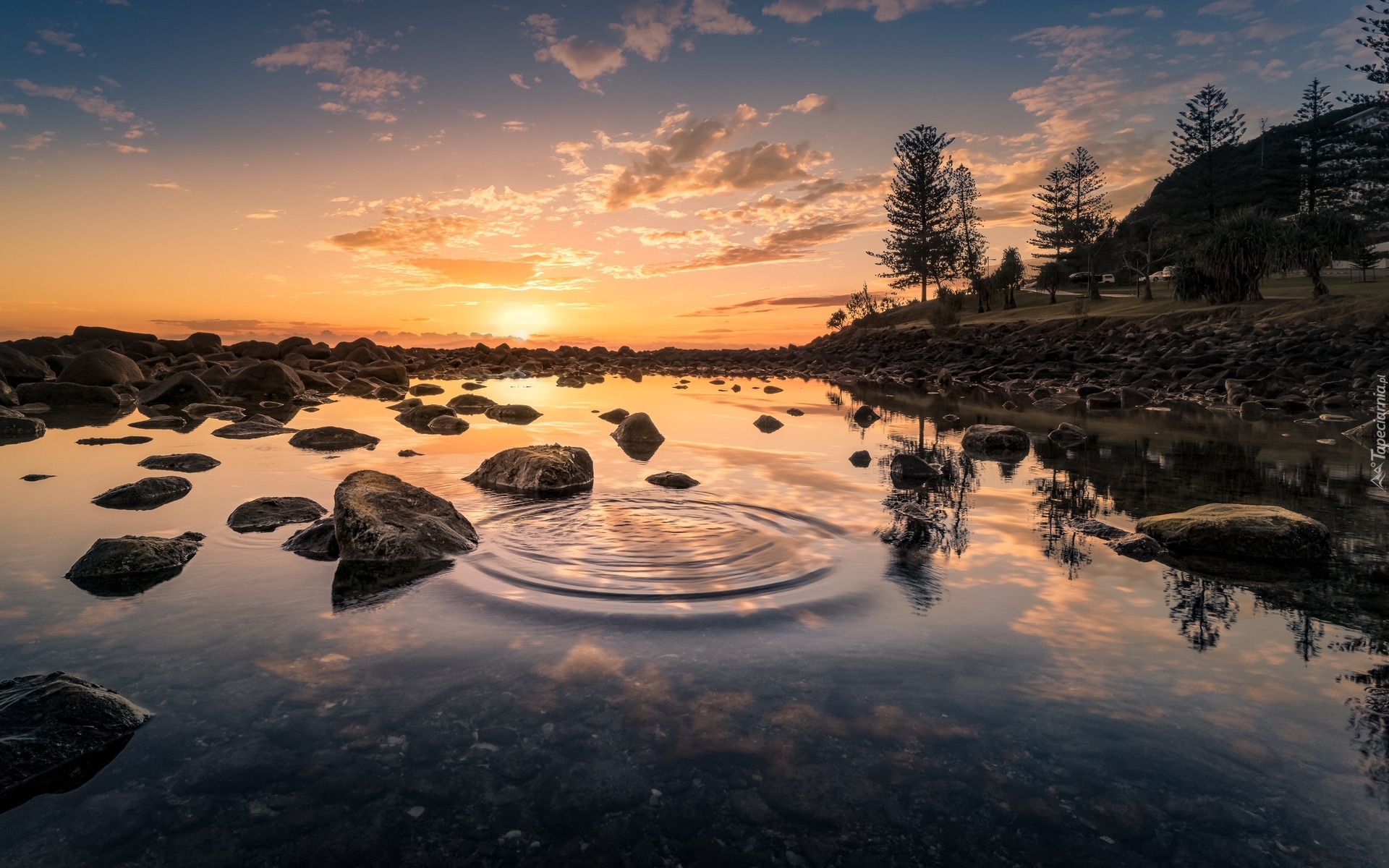 Edytor tapety: Zachód słońca nad kamienistym płytkim jeziorem