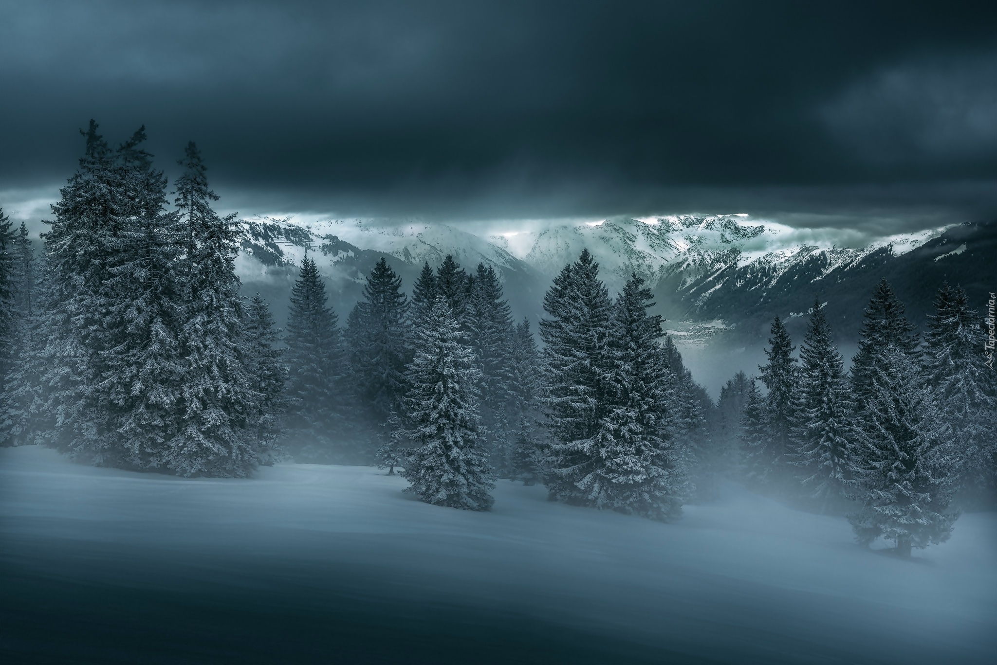 Edytor tapety: Zamglone góry i las w zimowym krajobrazie