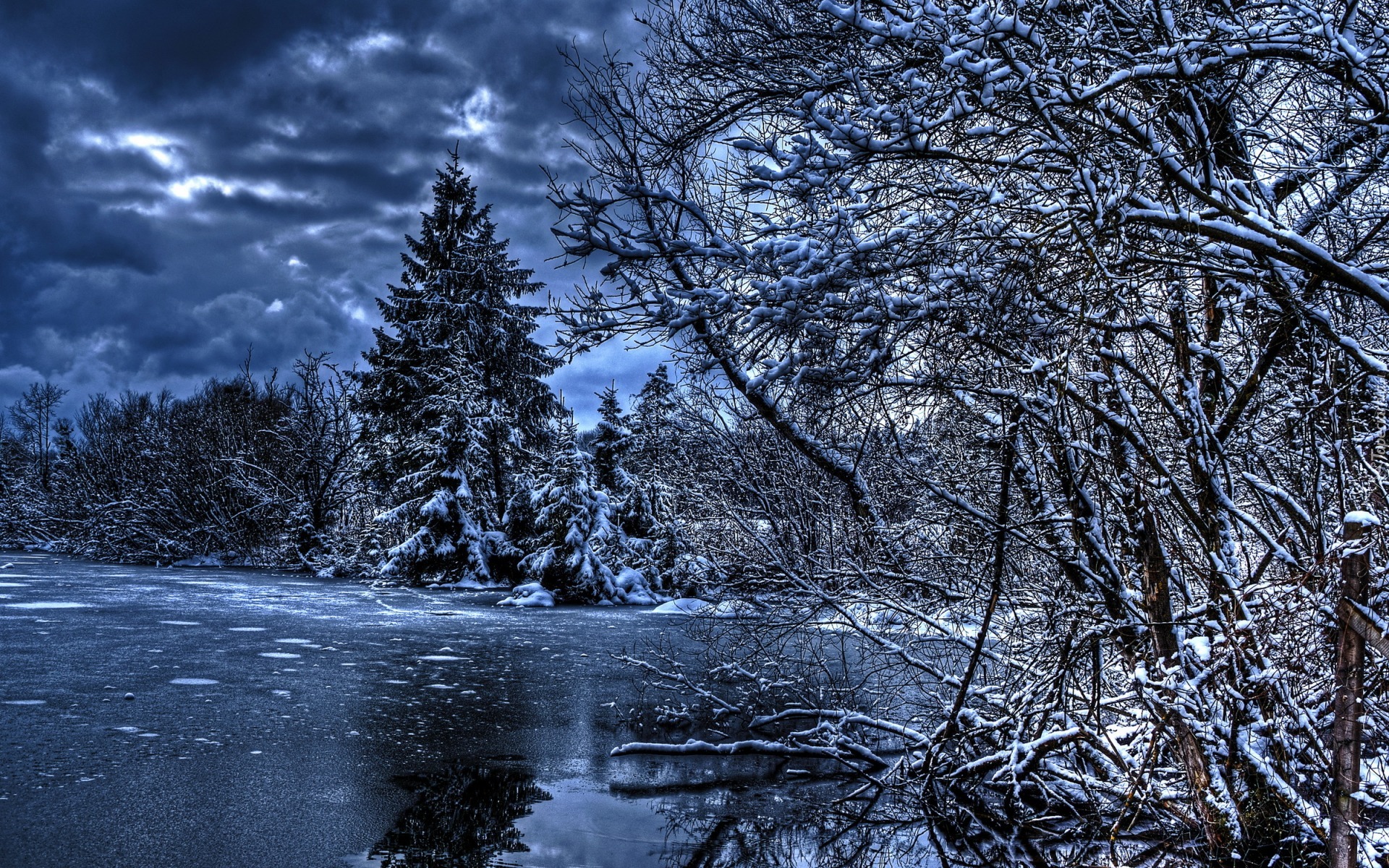 Edytor tapety: Ośnieżone drzewa nad oblodzoną rzeką o zmierzchu