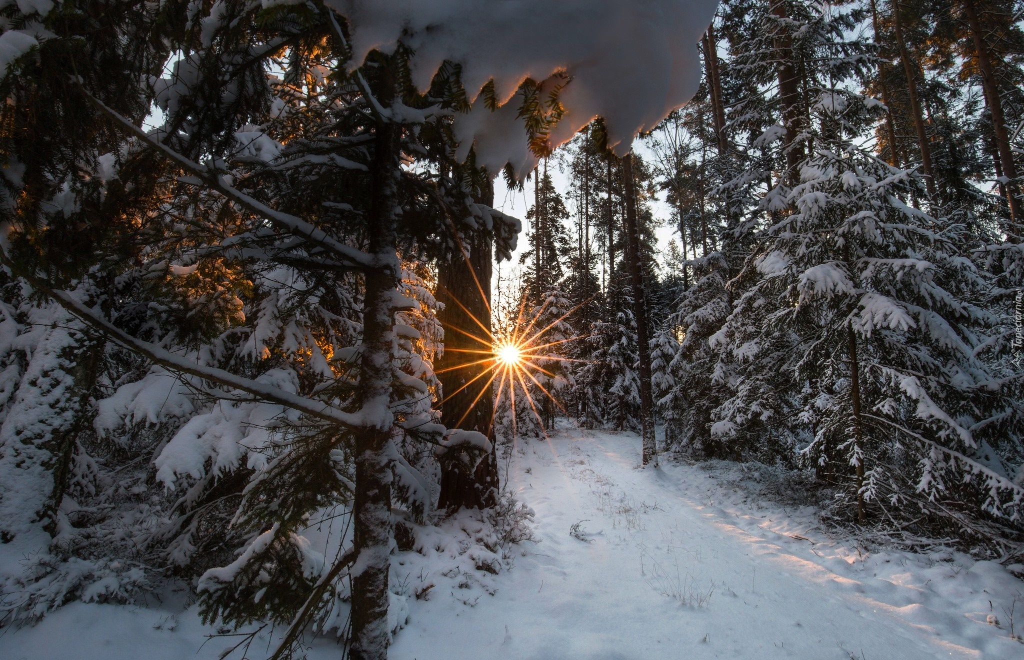 Edytor tapety: Wschodzące słońce oświetla drogę prowadzącą przez ośnieżony las
