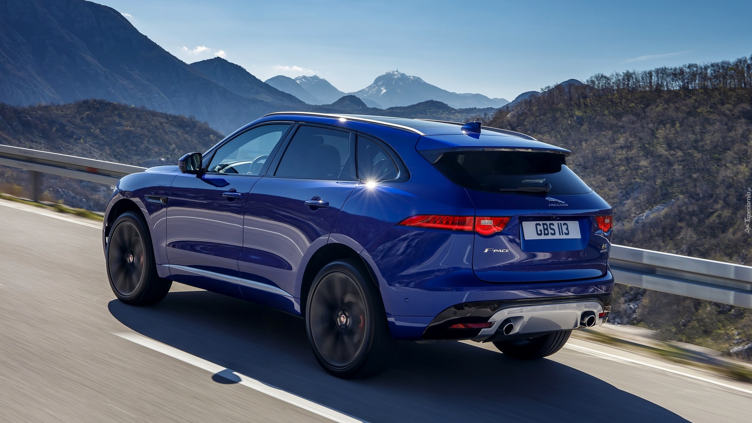 Edytor tapety: Niebieski Jaguar F-Pace pędzący drogą w górach