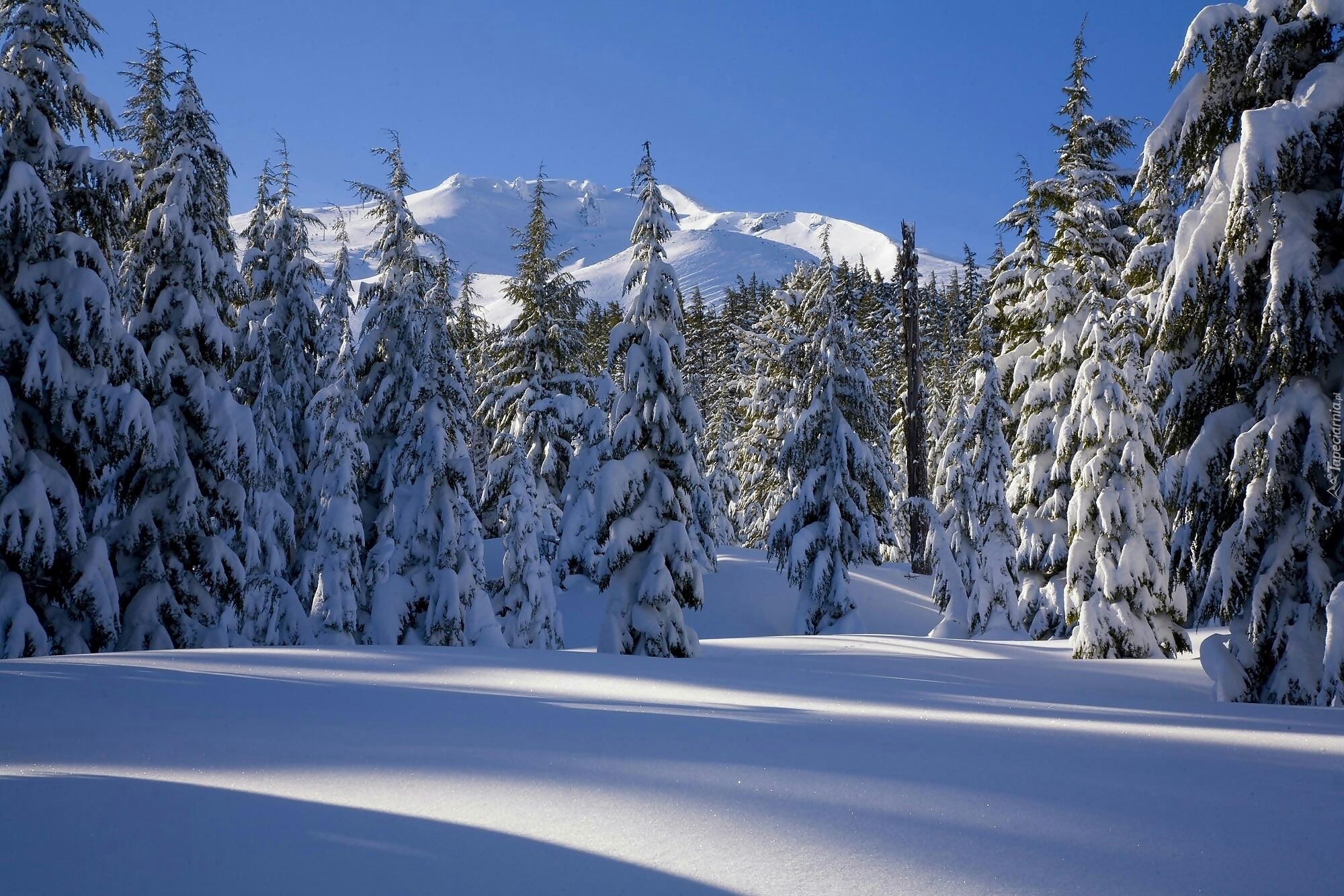 Edytor tapety: Ośnieżona polana z widokiem na las i góry