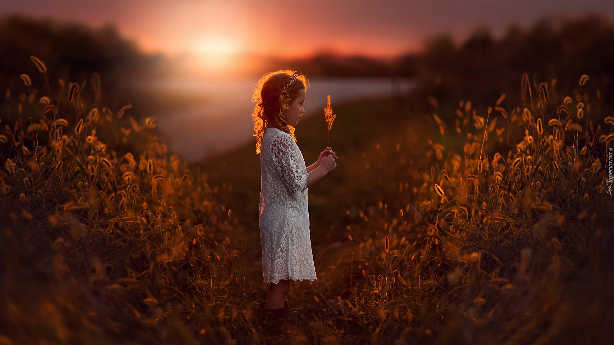 Edytor tapety: Dziewczynka ze źdźbłem trawy w blasku zachodzącego słońca