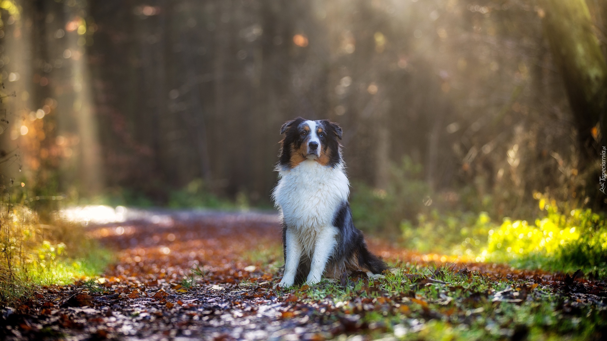 Edytor tapety: Owczarek australijski siedzi na leśnej drodze usłanej liśćmi