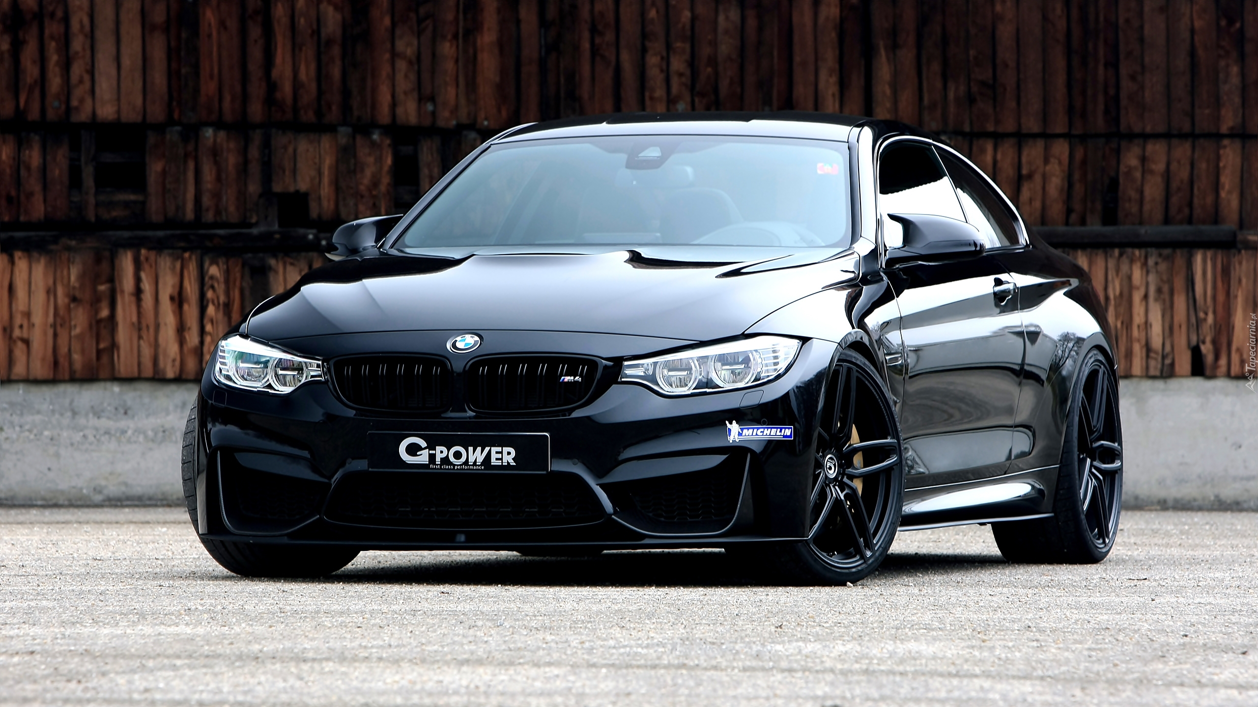 Edytor tapety: Czarny samochód BMW M4 na tle drewnianego budynku