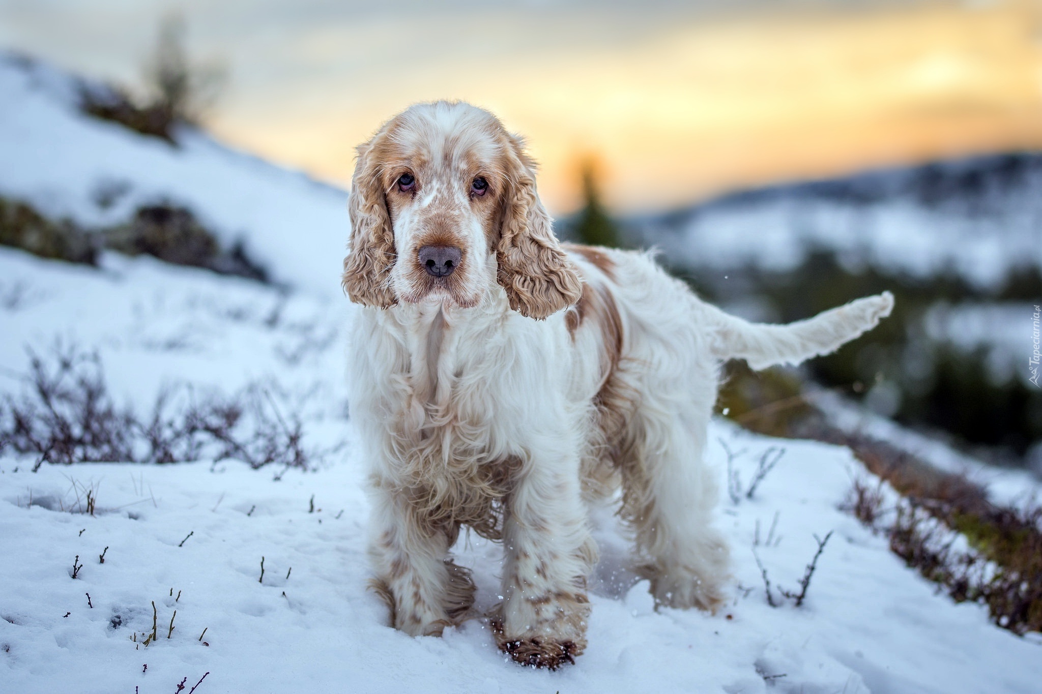 Edytor tapety: Cocker spaniel na ośnieżonym wzgórzu