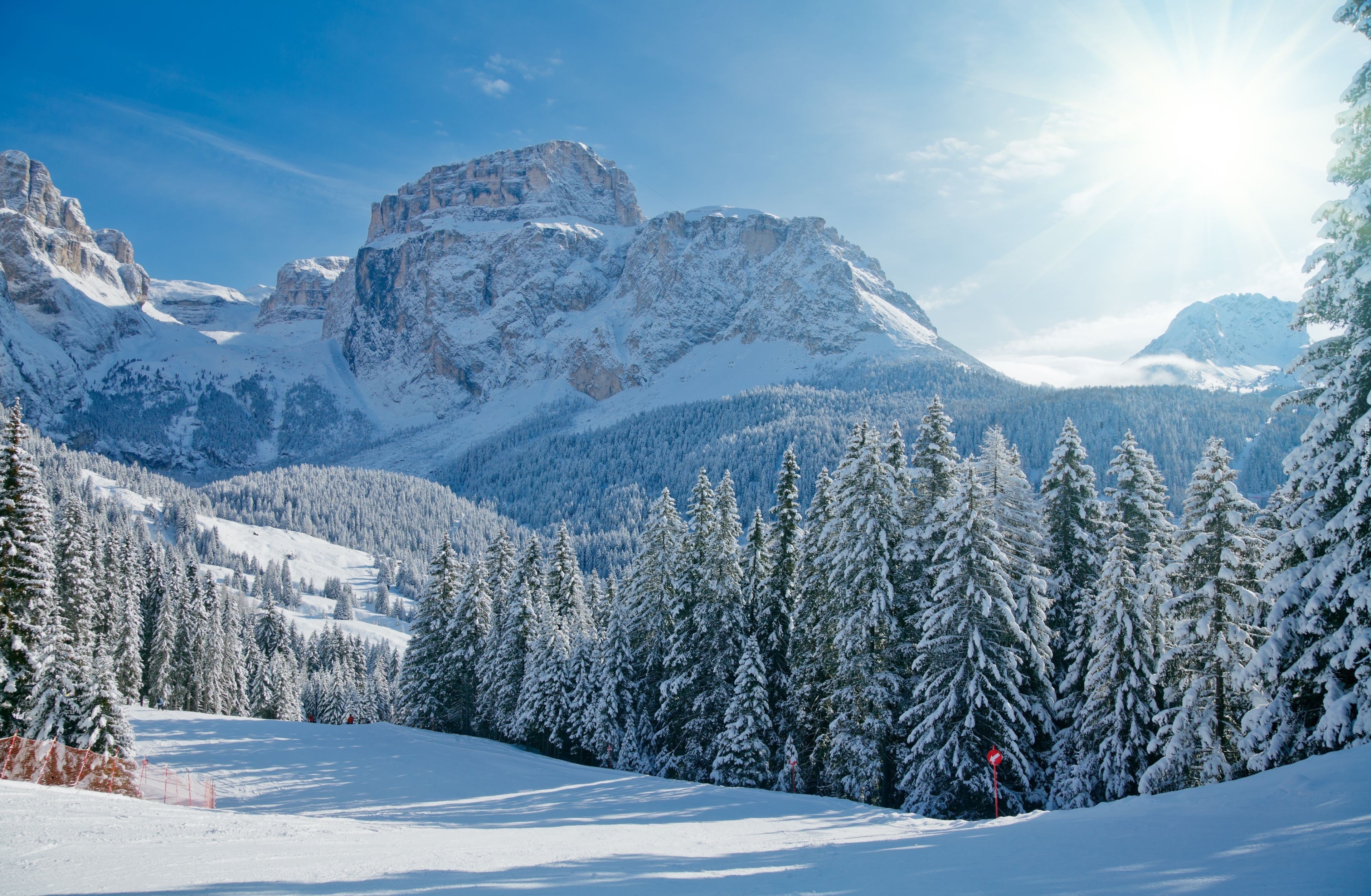 Edytor tapety: Zimowy krajobraz z górskim lasem w promieniach słońca