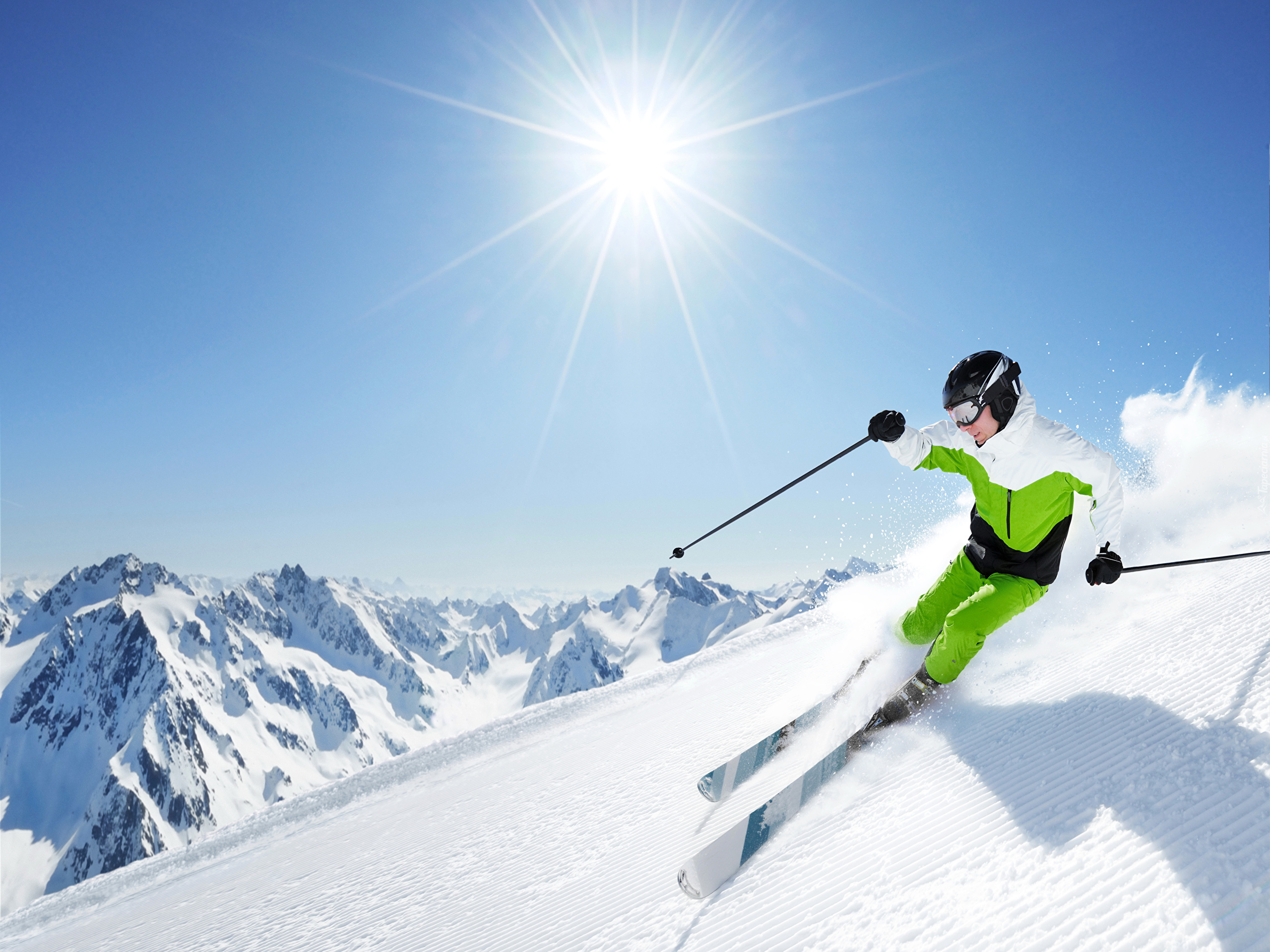 Edytor tapety: Narciarz zjeżdża z górskiego stoku w promieniach słońca