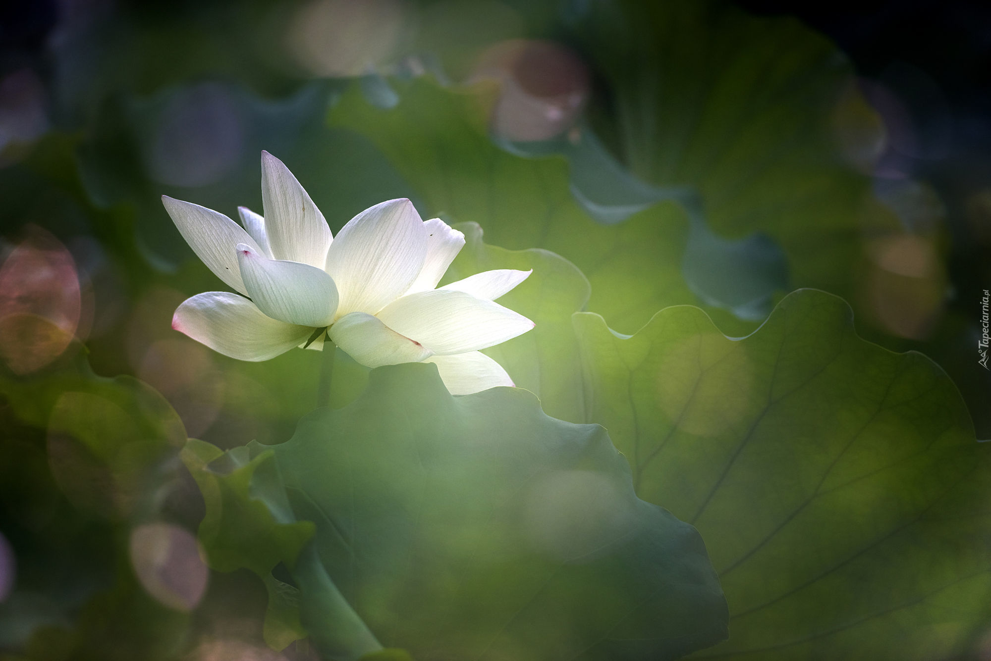 Edytor tapety: Rozwinięty kwiat białego lotosu pomiędzy liśćmi