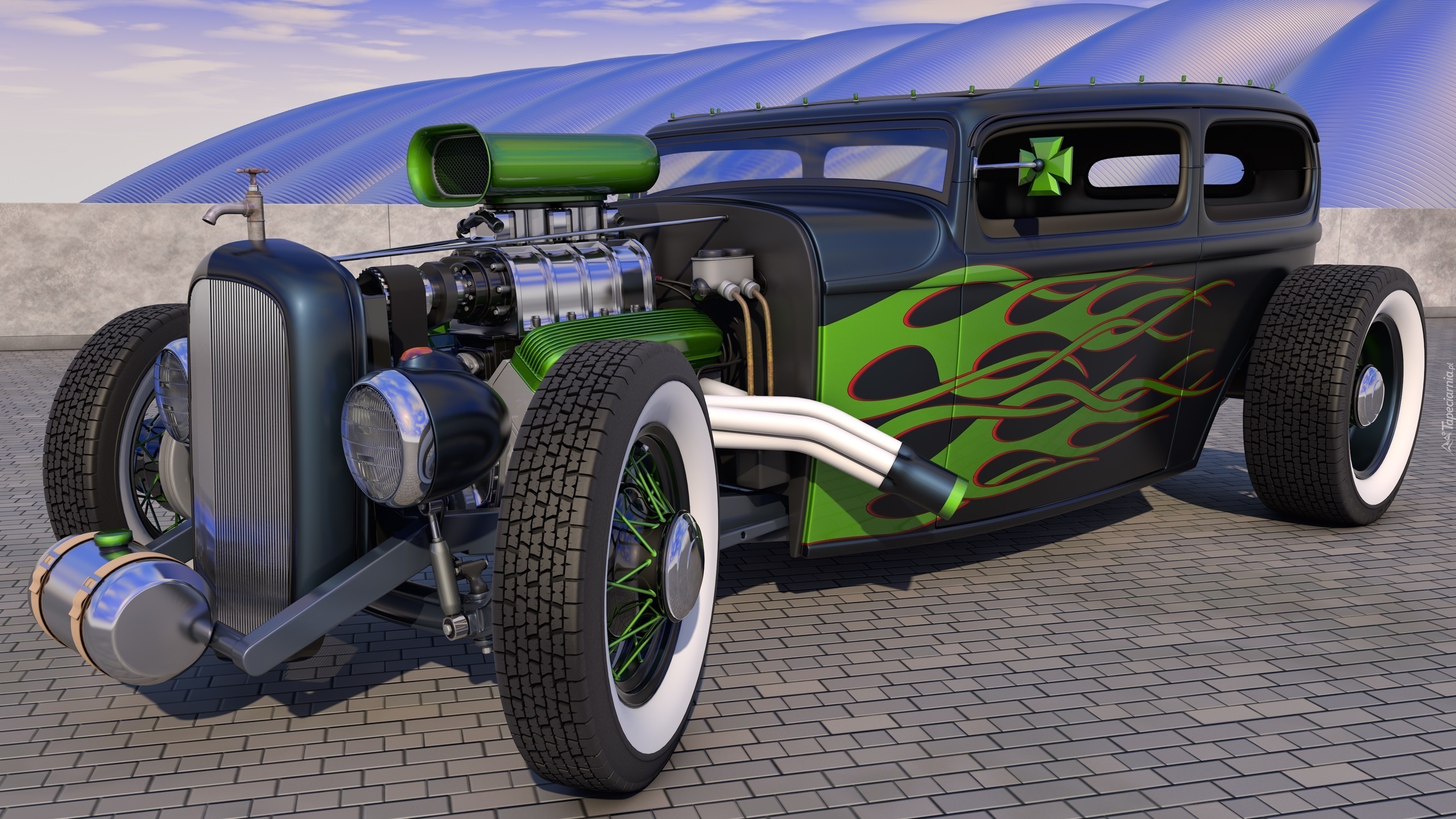 Edytor tapety: Ford Rat Rod z zielonymi płomieniami na masce