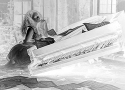 Edytor tapety: Zamyślona kobieta w białej sukni przy starym zniszczonym fortepianie z nutami
