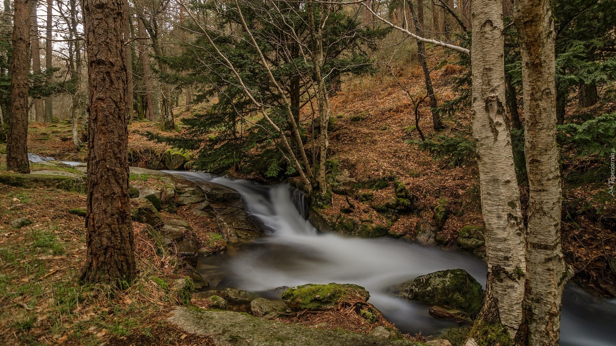 Edytor tapety: Leśny strumyk płynący po kamieniach pomiędzy drzewami