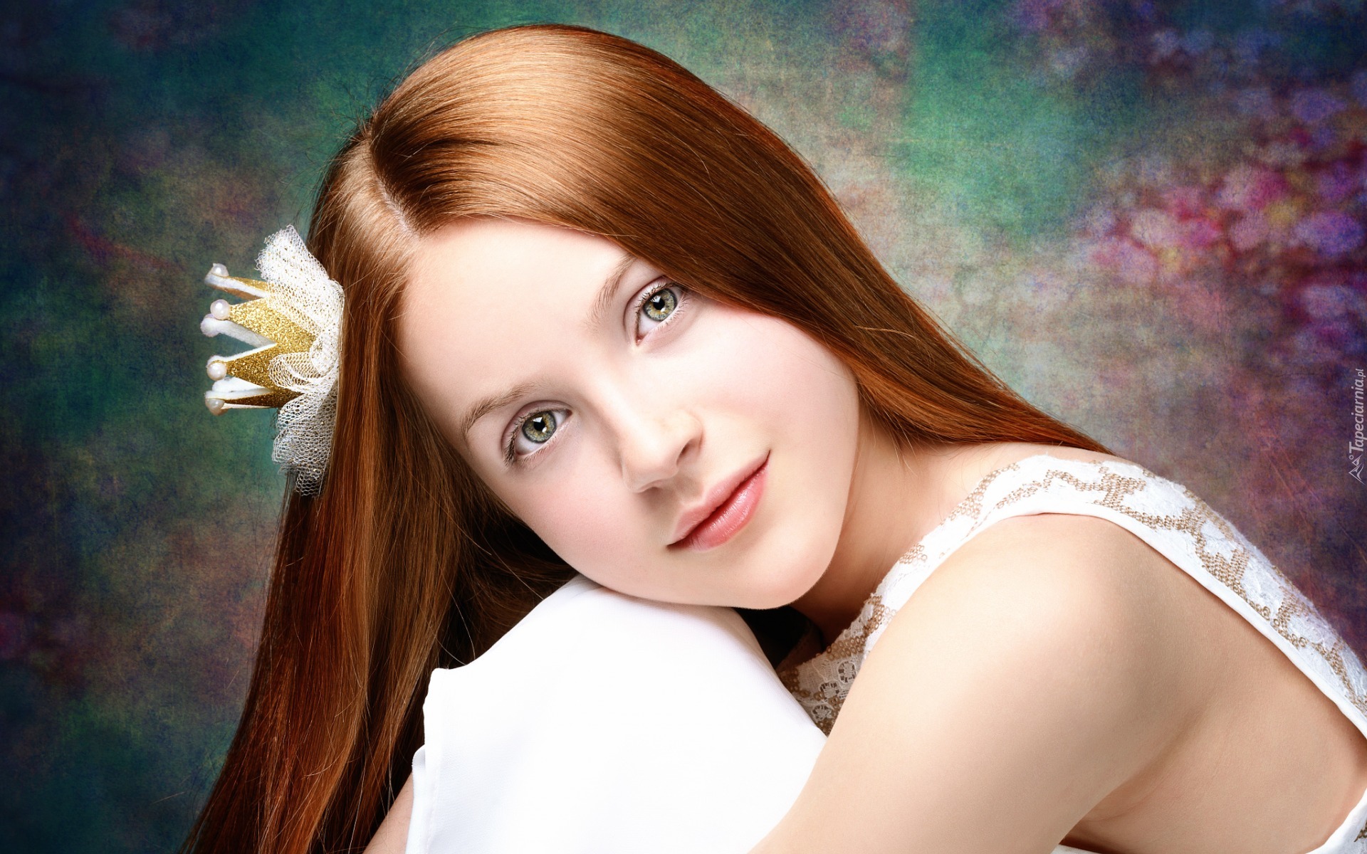 Edytor tapety: Ruda dziewczyna w sukience z ozdobą we włosach