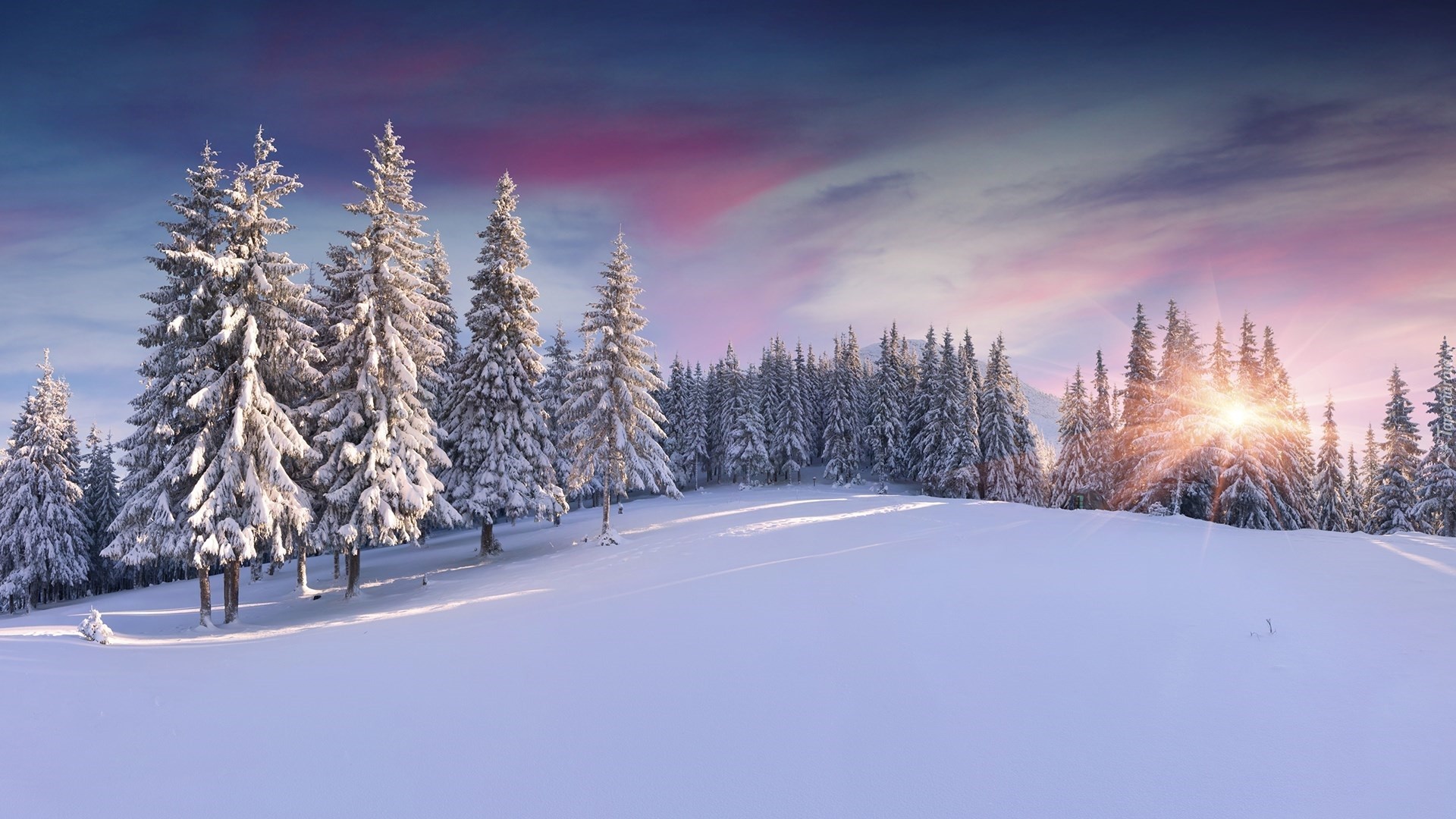 Edytor tapety: Promienie słońca pomiędzy ośnieżonymi drzewami w lesie
