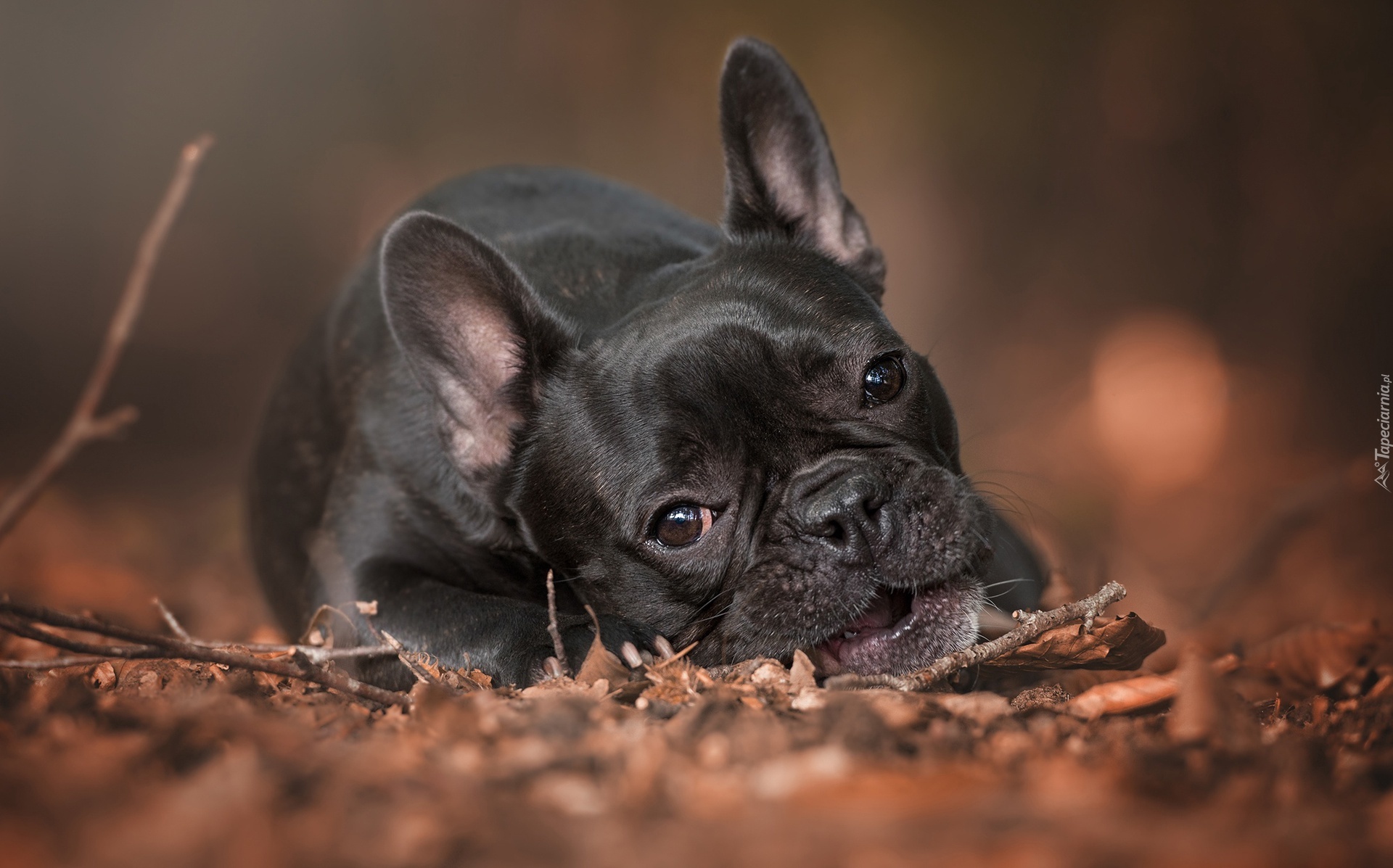 Edytor tapety: Czarny buldog francuski odpoczywa na jesiennych liściach