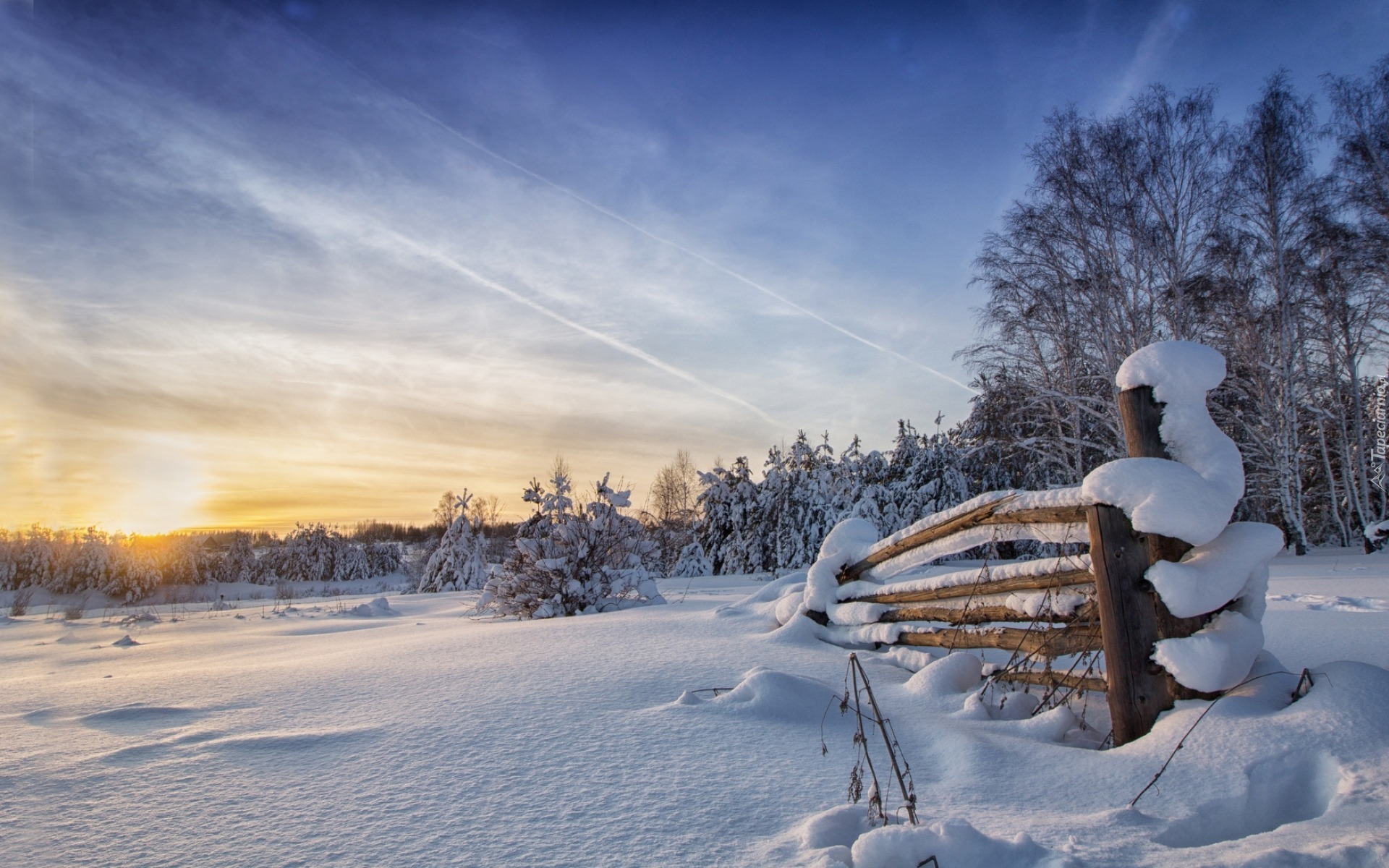 Edytor tapety: Płot i drzewa zasypane śniegiem o poranku