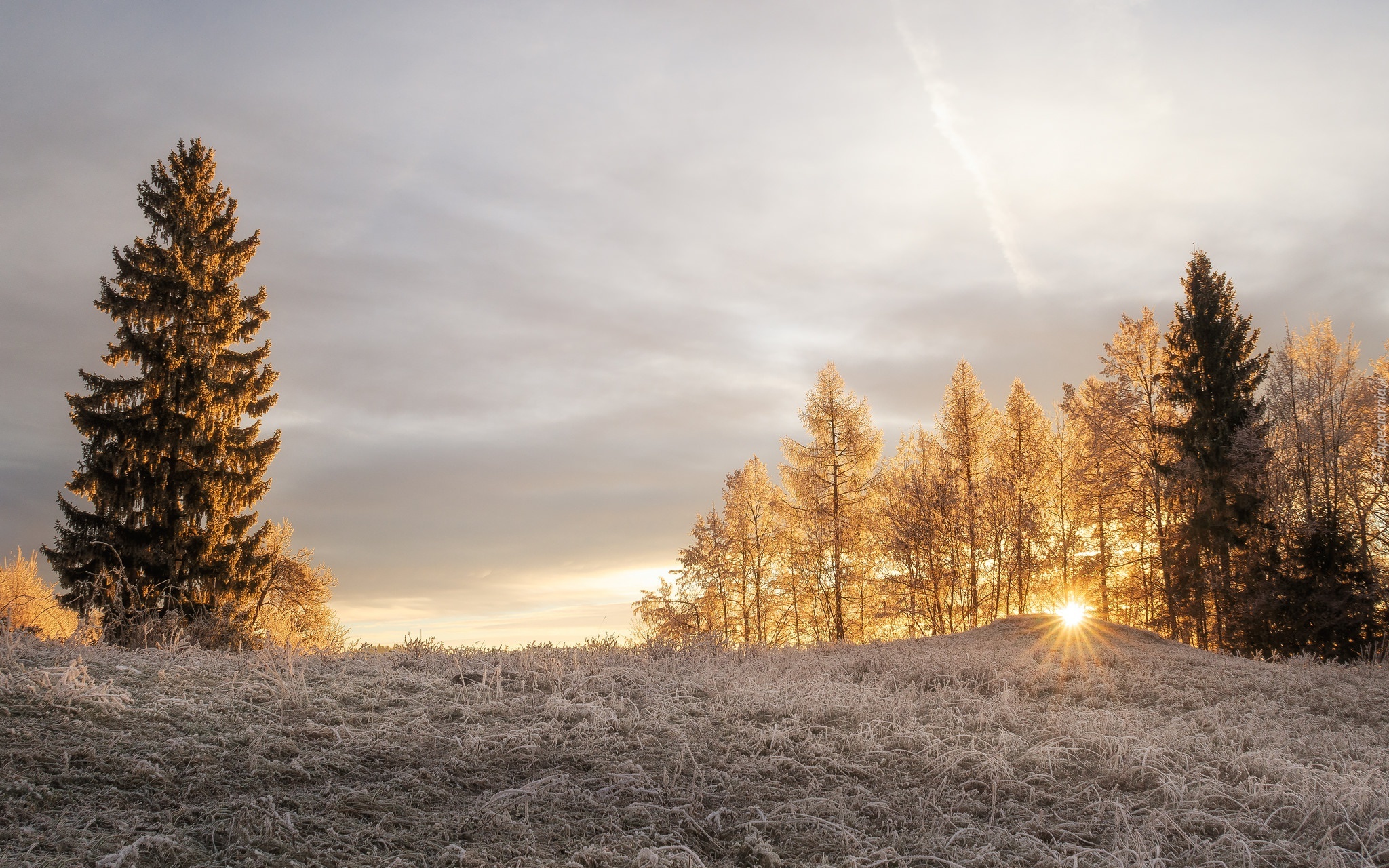 Edytor tapety: Promienie słońca przebijają przez drzewa na oszronione trawy