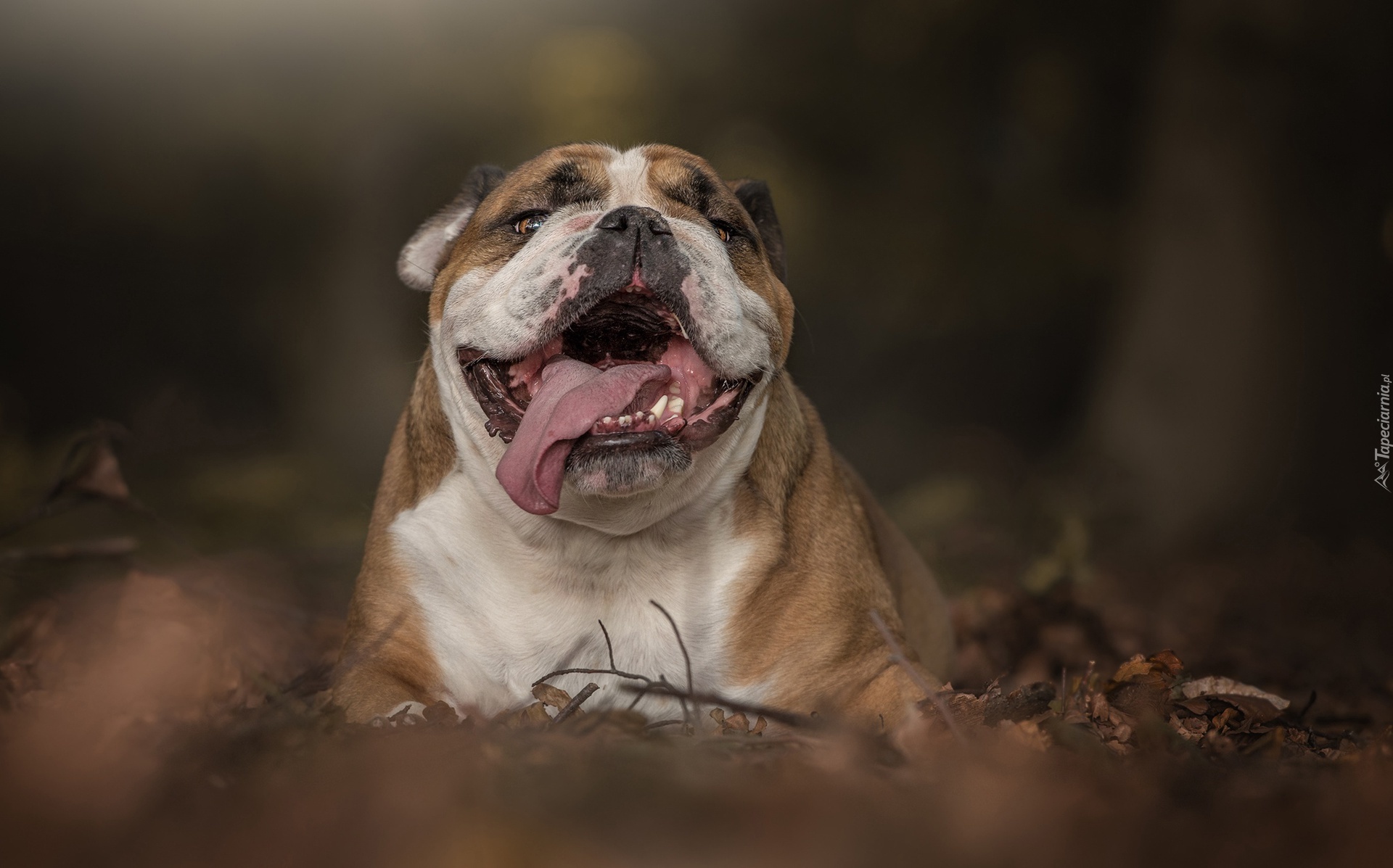 Edytor tapety: Zdyszany buldog angielski odpoczywa wśród liści
