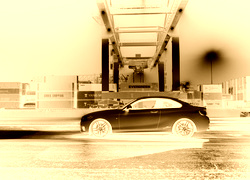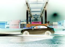 Edytor tapety: Białe BMW AC Schnitzer rocznik 2014 stoi pod dźwigiem obok kontenerów