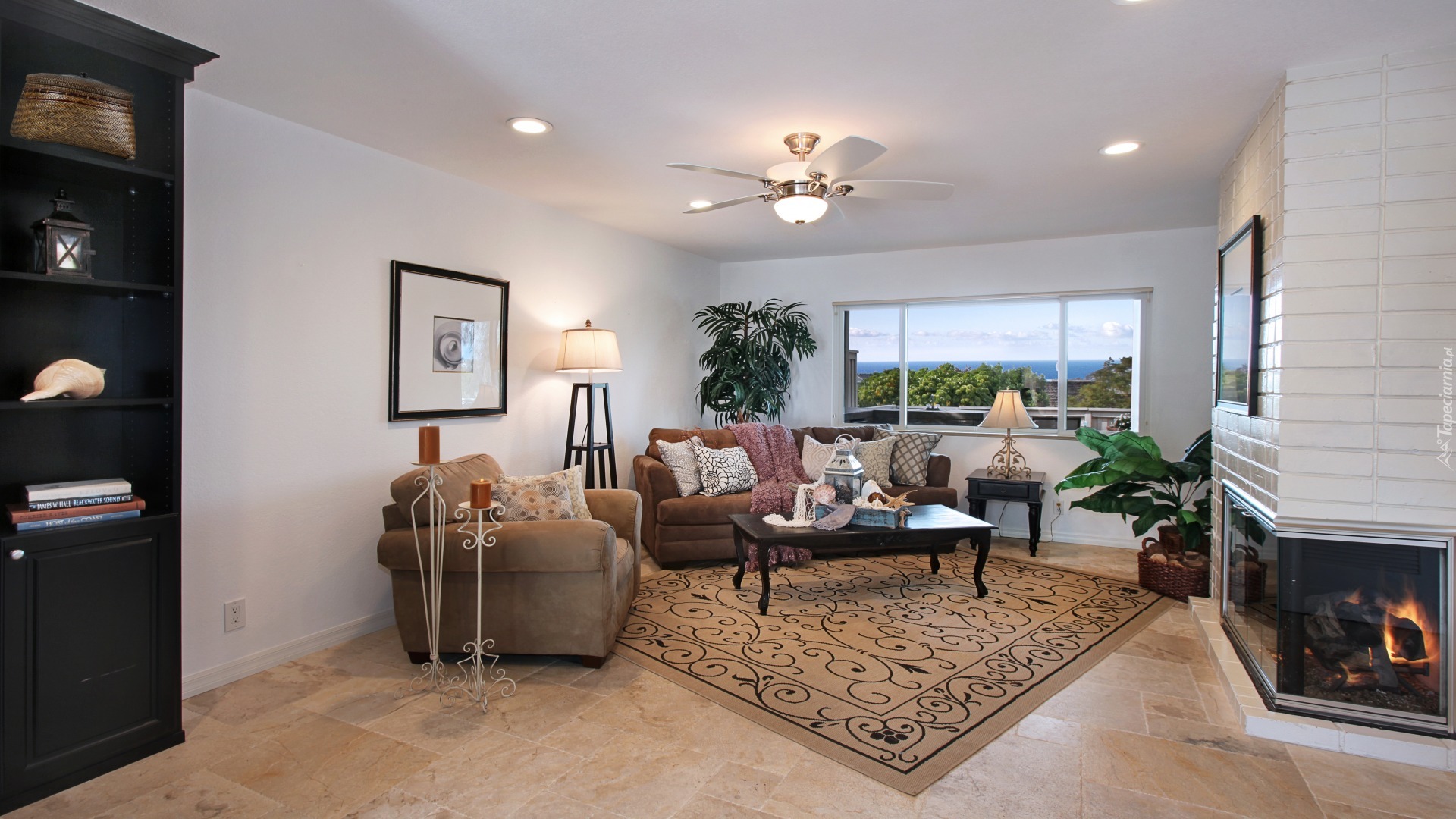 Edytor tapety: Umeblowany salon z kominkiem i dużym oknem