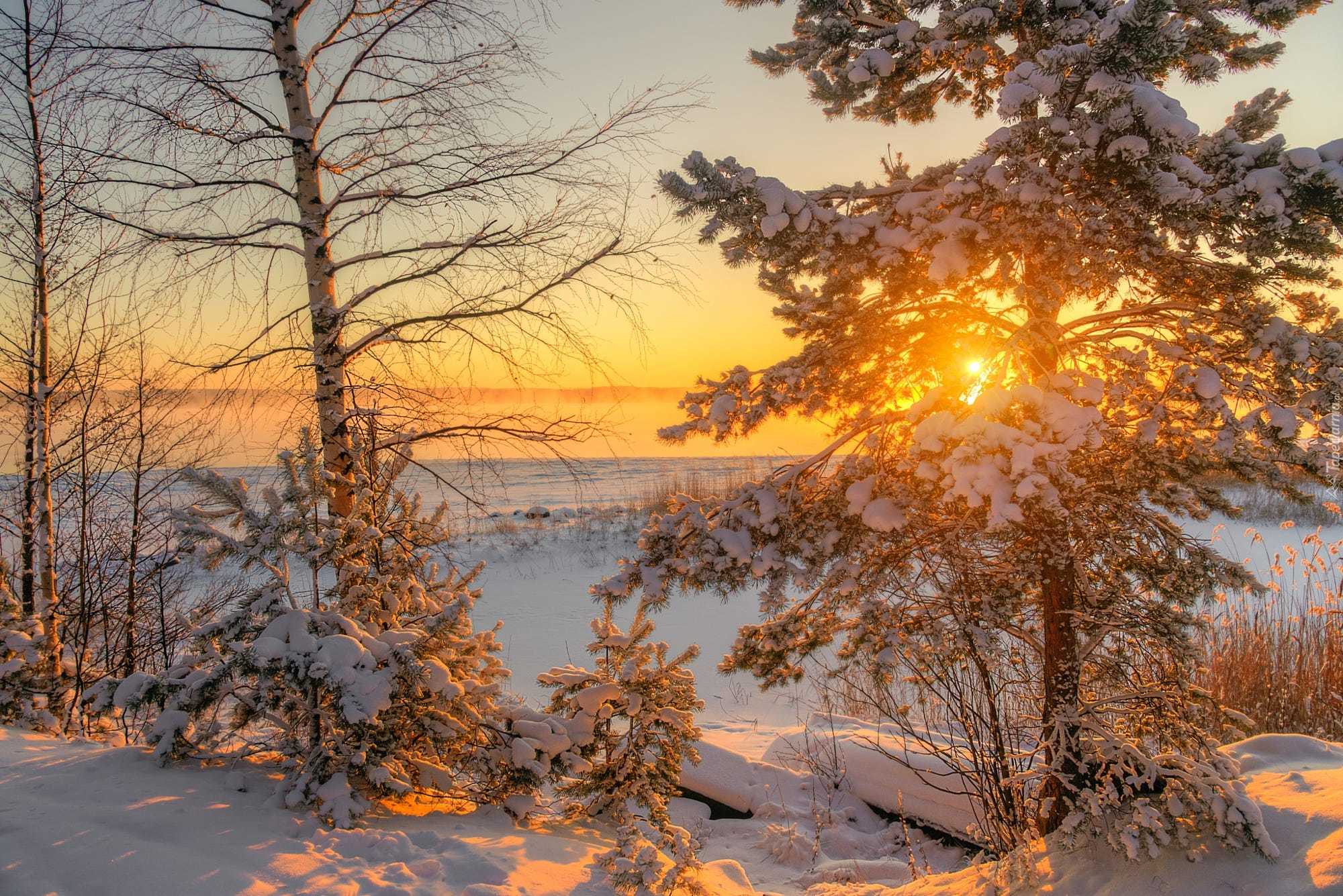 Edytor tapety: Pole i drzewa w promieniach zimowego słońca