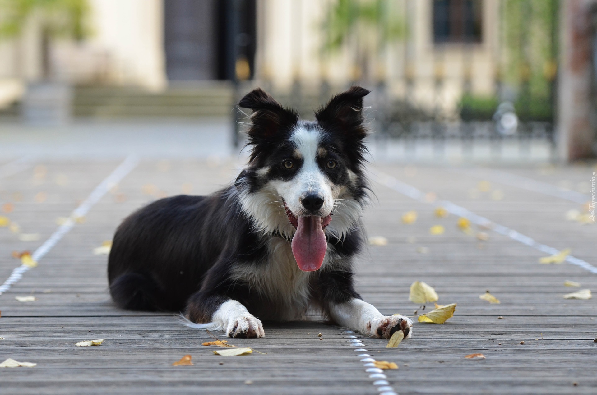 Edytor tapety: Leżący pies rasy border collie z wywieszonym jęzorem