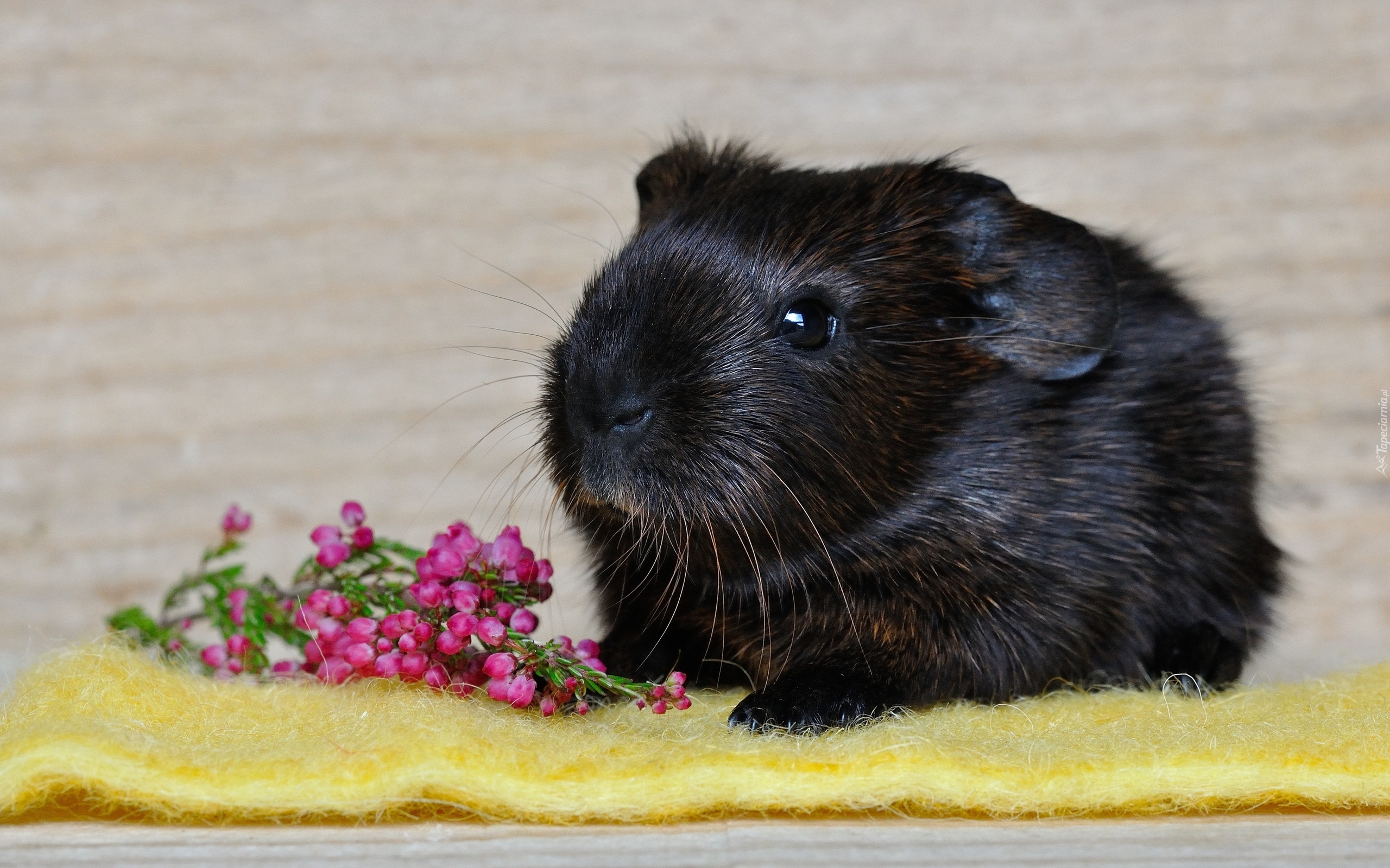 Edytor tapety: Czarna świnka morska obok bukieciku różowych kwiatków
