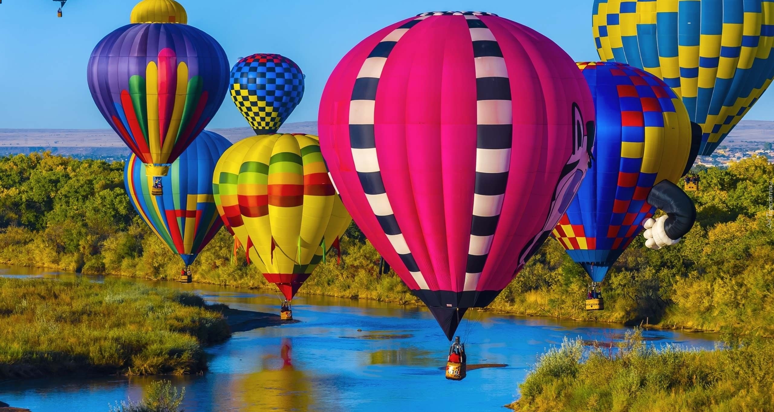 Edytor tapety: Kolorowe balony nad rzeką wśród drzew
