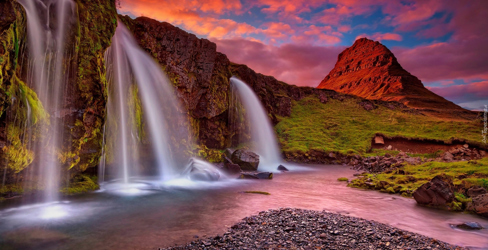 Edytor tapety: Islandzkie wodospady z górą Kirkjufell w tle